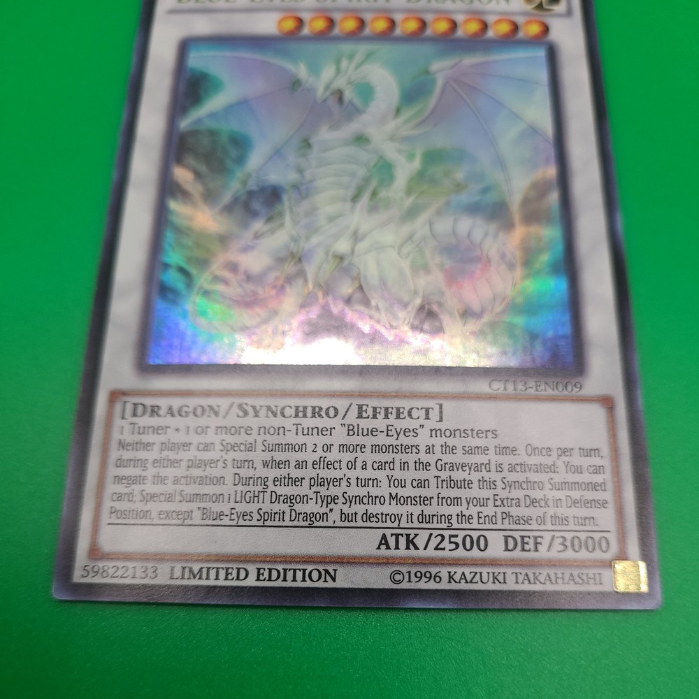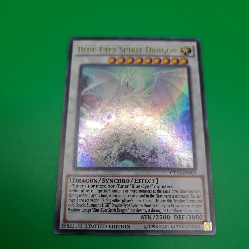 Elevate your Yu-Gi-Oh! TCG collection with the legendary Blue-Eyes Spirit Dragon, a must-have for players and collectors alike. From the 2016 Mega-Tins series, this Ultra Rare card boasts an impressive attack power of 2500 and a formidable defense of 3000, making it a formidable force in the game's syncronization battles. Card number CT13-EN009, this limited edition piece features the iconic Light attribute and comes in English language. Produced by Konami, the card's ungraded state leaves room for professional assessment, while its synchro and effect capabilities make it a versatile addition to any deck. Own a piece of Yu-Gi-Oh! history with this 2016 Mega-Tins limited edition dragon.