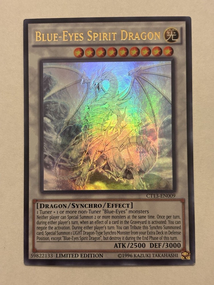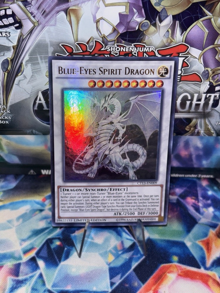 This Blue-Eyes Spirit Dragon card is a must-have for any Yu-Gi-Oh! collector—stunning artwork, powerful stats, and game-changing effects. The 2016 Limited Edition Ultra Rare version looks incredible in any deck, and its ability to counter Graveyard plays makes it a competitive staple. Perfect condition, great value, and iconic artwork—totally worth adding to your collection!