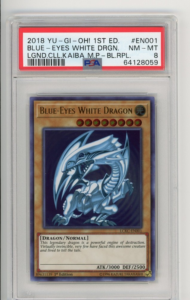⭐ DONNELLY TRADING CARDS ⭐ Blue-Eyes White Dragon 1st Edition Holo | LCKC-EN001 | PSA 8 | 2018 Yu-Gi-Oh Great vintage gift for yourself or another collector - birthdays, anniversaries, or this year's holiday season!! 🎁🙂 STORE POLICIES 🔥📦 FAST SHIPPING: SHIPS SAME OR NEXT BUSINESS DAY after payment!!! :) 🔒✉ PACKAGING: All booster packs ship in IRONCLAD PACKAGING : Acid-free booster pack sleeve Hobby Armor "Cardboard Sandwich" Bubble Mailer Easy-remove painter's tape 🆓🔁 FREE RETURNS: Free 30-day returns! International buyers – please note: Import duties, taxes, and charges aren't included in the item price or postage cost. These charges are the buyer's responsibility. Please check with your country's customs office to determine what these additional costs will be, prior to bidding or buying. Additionally, please note that due to the logistics involved, we cannot offer returns for international customers. Thank you!