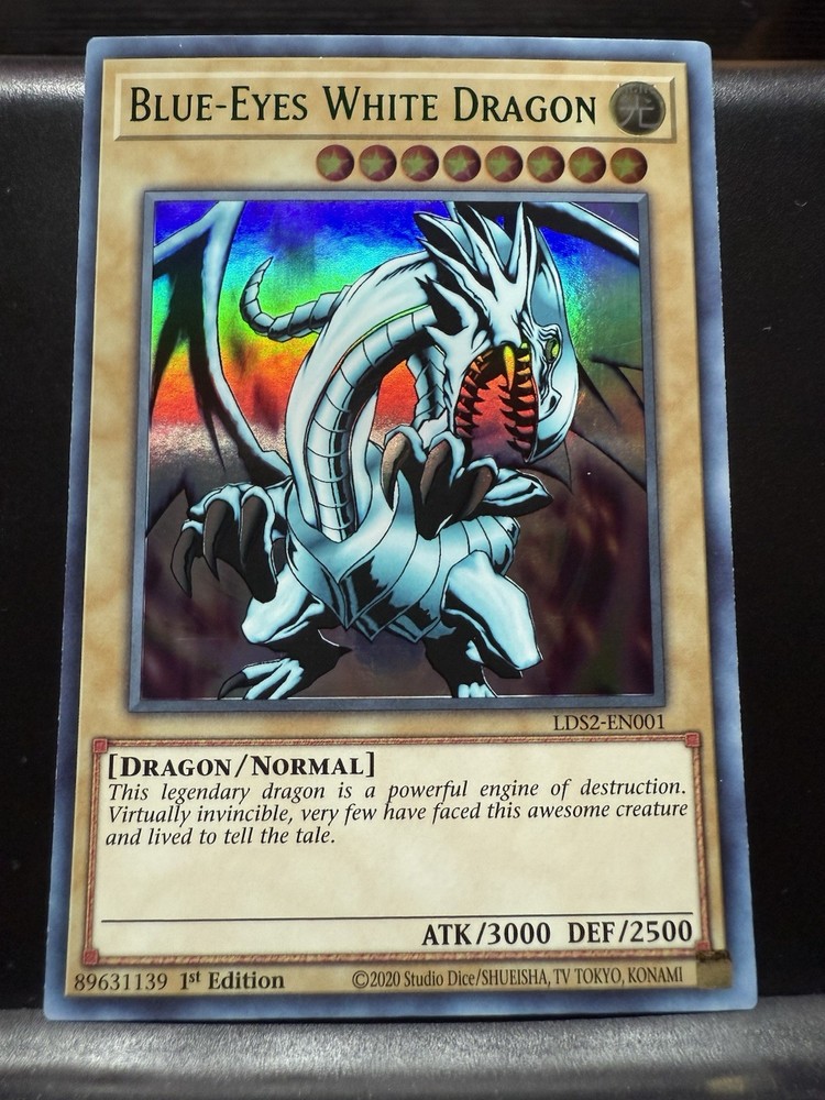 Elevate your Yu-Gi-Oh! collection with the iconic Blue-Eyes White Dragon (Green) card, a must-have for players and collectors alike. From the Legendary Duelists: Season 2 set, this Ultra Rare card, numbered LDS2-EN001, boasts the sought-after 1st Edition feature, marking it as a valuable and noteworthy addition to any deck or display. The card's pristine white attribute ensures a striking visual appeal, complementing its powerful in-game abilities. Whether you're looking to dominate the battlefield or simply appreciate the artistry of Yu-Gi-Oh! cards, this Blue-Eyes White Dragon is a quintessential piece for your collection or next strategic play.