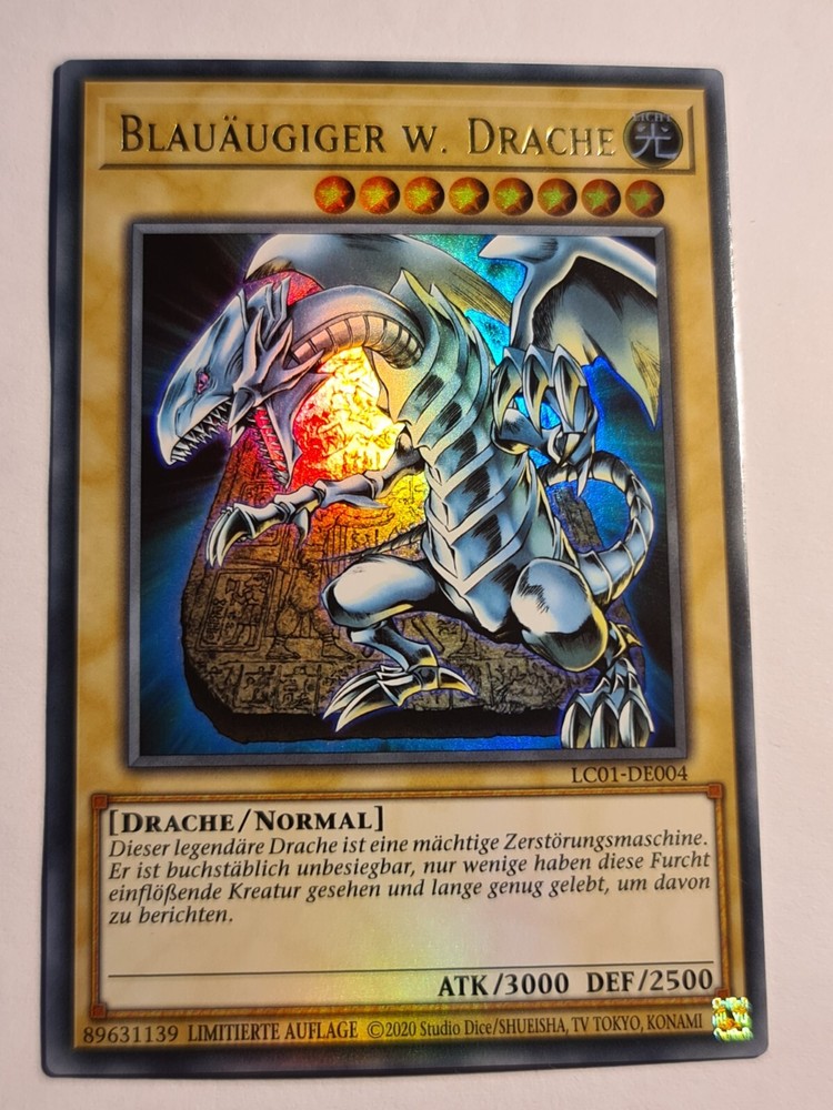 This Blue-Eyes White Dragon is a must-have for any serious Yu-Gi-Oh! collector! The ultra rare German version looks stunning, and the near-mint condition is flawless. The artwork pops beautifully, and it's a fantastic addition to any deck or display. Super happy with this purchase—highly recommend for fans of the classic series!