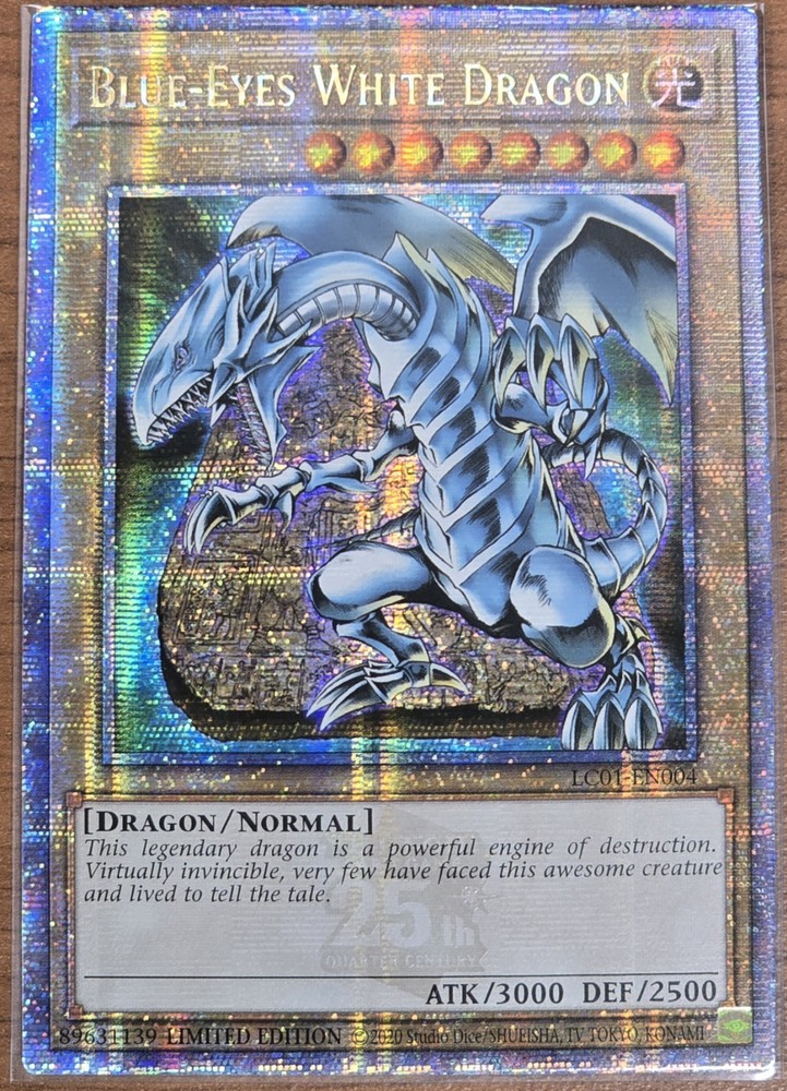 Unleash the power of the legendary Blue-Eyes White Dragon from the Legendary Collection: 25th Anniversary Edition, a must-have for any serious Yu-Gi-Oh! TCG collector or player. This Quarter Century Secret Rare card, numbered LC01-EN004, features the iconic dragon in stunning foil finish, capturing the essence of its strength and mystique. Ideal for duelists looking to enhance their deck or collectors seeking a prized piece, the Blue-Eyes White Dragon card comes in English language and boasts the lighter color attribute, aligning with the strategic gameplay of the Yu-Gi-Oh! TCG. Manufactured by Konami in 2020, this card maintains the standard Japanese size for seamless integration into your collection.