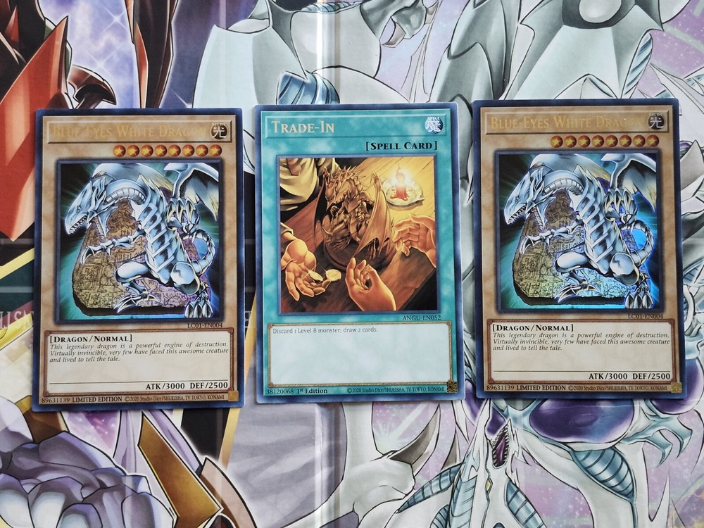 This sale is for 3 yugioh cards. Blue-eyes White Dragon, x2 Limited Edition Ultra Rare Light Play LC01. Trade In, x1 1st Edition Rare Light Play ANGU. Delivery can take up to 30 days.