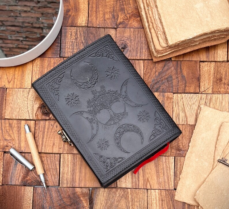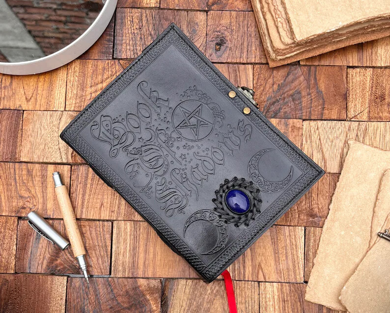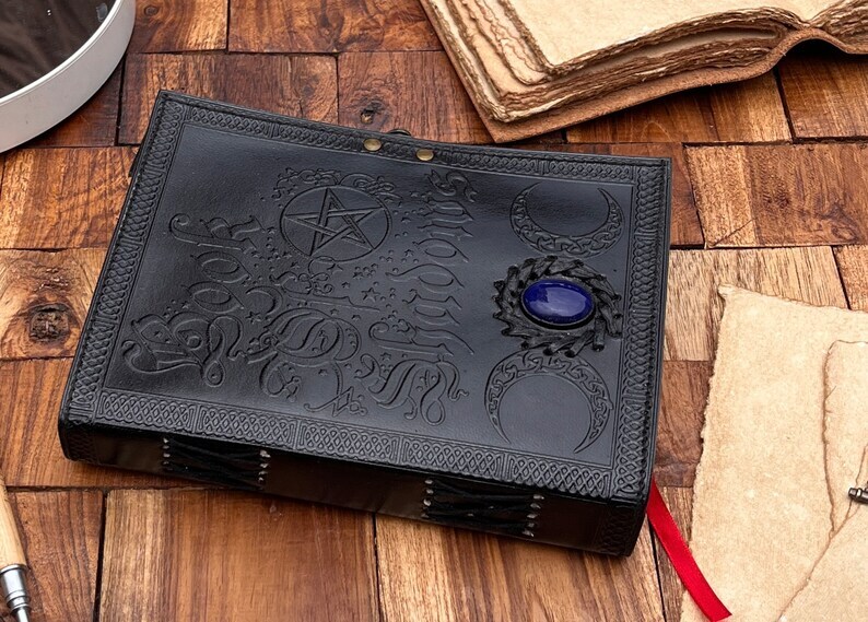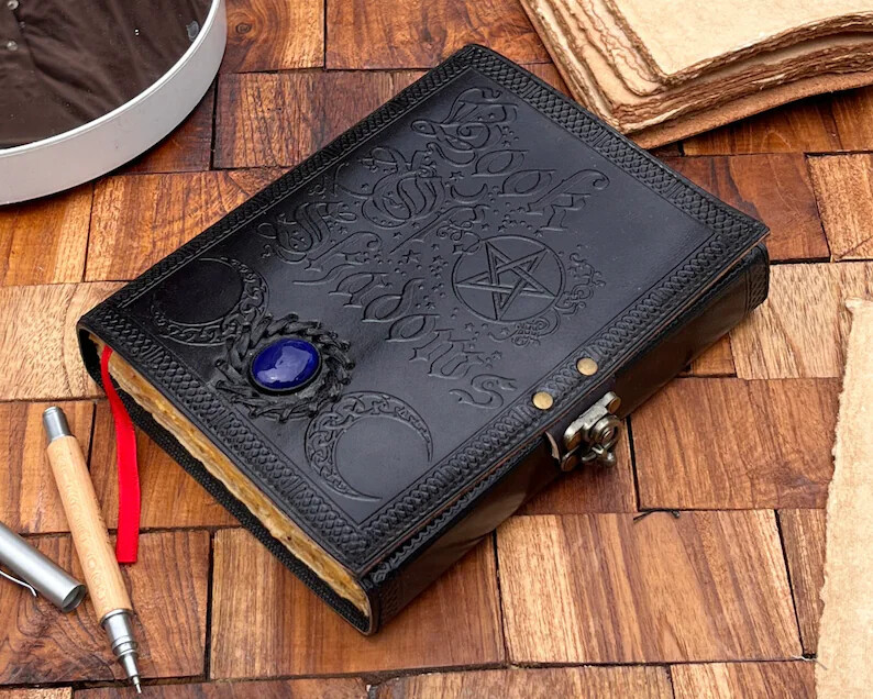 Book Of Shadows Leather Journal Magic Book The Morrigan Leather grimoire Celtic journal Travel notebook, Christmas Gift, anniversary gifts. • Beautiful Embossed. • Lapis Lazuli Stone • Sizes - 7×5 inches, 8x6 inches, 10x7 inches, 13x10 inches • Color - Antique Charcoal • Vintage lock closure • Genuine buffalo leather • Vintage deckle edge old paper • handmade rustic cotton paper • 100 Sheet (200 pages both side) ● Antique Paper - Vintage Journal is made of unique vintage paper which looks like it was pulled from history. You will love the old looking handmade cotton paper (200 pages) which is unique to our vintage journals. ● EXQUISITE & UNIQUE SEMI PRECIOUS STONE:The vintage journal is embossed with a special stone called “lapis lazuli” which helps to reveal inner truth within yourself and encourage self-awareness and self expression. We have taken extra to make sure that the emboss is perfect in every piece. ● VINTAGE LOCK AND STURDY BINDING - The vintage lock will keep all your valuable writing locked inside.Sturdy hand stitched binding to make sure that no paper comes out loose from your vintage notebook. ● Use Any Kind Of Pen - Sketch, Doodle, Write on your journal notebook with a Calligraphy Pen Fountain Pen, Brush Pen, Ball Pen, Acrylic Colours, Watercolor and many more. ◆ {Multiple Uses} ● The vintage leather journal is a perfect sketchbook, drawing journal, great gift, book of shadows, grimoire journal , wicca journal , calligraphy journal, story writing, scrapbook, art journal, leather sketchbook, travel journal, journals for women and many more. This stunning handmade leather journal is perfect for anyone who loves to write or sketch. With a beautiful Sun and Moon design on the cover, it's sure to be a conversation starter. The journal is blank inside, with no lines or dots, giving you complete freedom to create whatever you like. Crafted from high-quality leather, this journal is durable and made to last. Whether you're using it as a diary, a sketchbook, or a place to jot down your thoughts, this journal is sure to become a cherished possession. With special attributes like being a 1st edition and being made in India, it's a unique and special item that you won't want to miss out on. PAYONEER I accept Payoneer. COUNTRY: Shipping Worldwide from INDIA TYPE: Standard Int'l Flat Rate Shipping OTHER: I usually ship within 24 hours after receipt of payment. The delivery time from Ukraine: 10-25 days. Item will be qualitatively packed. Always leave a positive feedback to good ebayers. 30-Day return policy : I guarantee you complete satisfaction with all my high quality products. If you receive an item you did not order or if an item you ordered is received damaged or defective, I will refund you the price you paid for it or replace it with identical one.