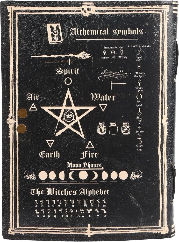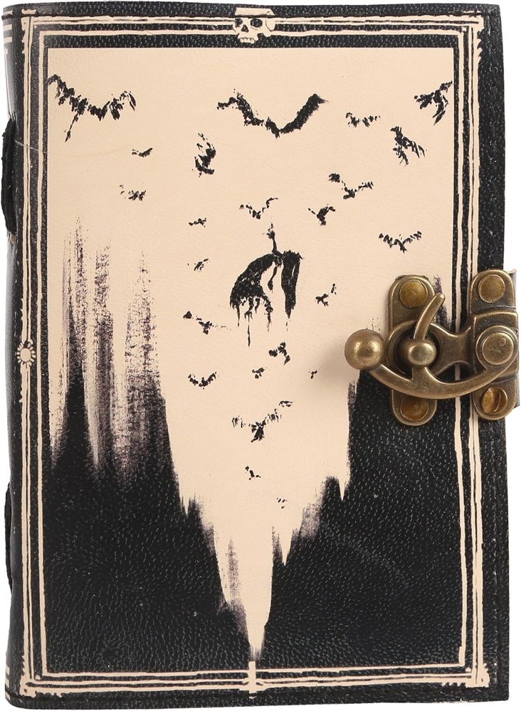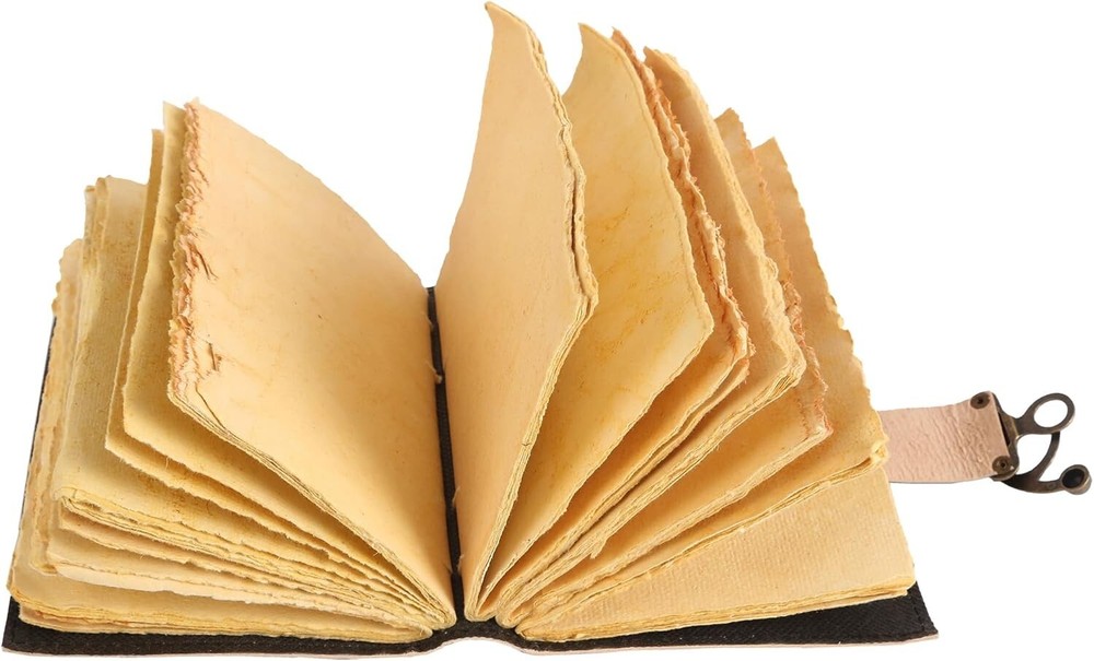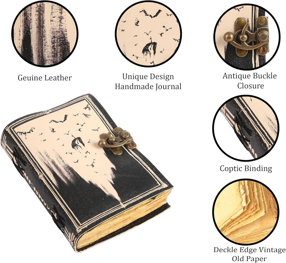 BEAUTIFULLY CRAFTED: Our handmade artisan leather bound spell book grimoire journals are crafted from genuine leather. The black colouring gives it a beautiful antique vintage feel. Being hand-made from natural leather. The cover features a beautiful gold designing. IDEAL SIZE & THICK PAPER: Compact 7X5" size, easy to carry around or slip into a bag; and not so small that you can’t express any creativity - 240 pages of smooth craft paper allowing the pen to glide effortlessly across the page. PERFECT FOR GIVING: Suitable for both men or women to write in, this locking diary daily travelers notebook is perfect for an avid writer, or lover of enchanted tales fan looking for a magic spell book. Ideal to give as a birthday gift, valentines, halloween, graduation or wedding anniversary present. MYSTICAL DESIGN:Immerse yourself in the world of magic with a leather-bound journal featuring a mystical design, perfect for capturing your spells, rituals, and spiritual reflections. Handcrafted to perfection by the artisans of Rajasthan, India. OUR PROMISE: We are positive you will love our products, but if you don't for any quality reason, we will replace or refund for up to 30 days after purchase. Our friendly customer service team are always available to answer any questions you might have. MANY USES - This aesthetic Guardian of nature Journal can be used as a Hocus Pocus gifts , the lovers tarot journal, gothic notebook, skull journal, spell books halloween decorations, book of spells halloween decor. grimoire spell book, drawing or sketching and compact for carrying in your bag. Ideal for alternative Artist Sketchbooks, Photo Album, Traveling Notes, Business Executive, Logbook, hocus pocus spell book , Journalists, Food Planner, old spell notebook, antique handmade skull journal.