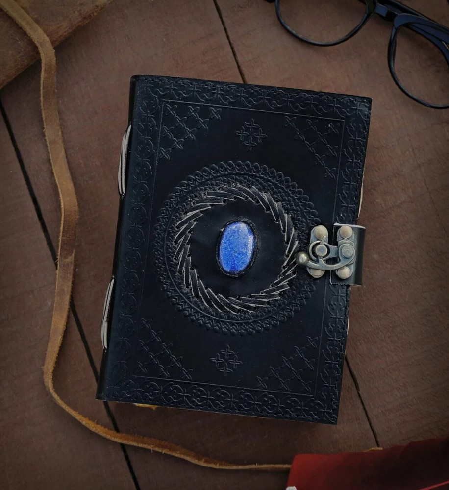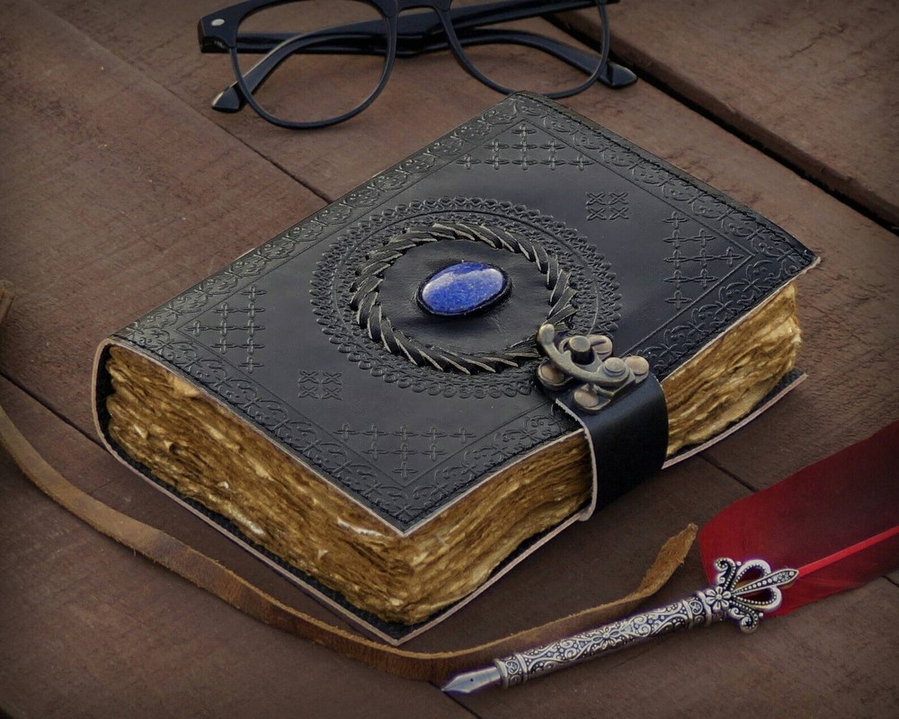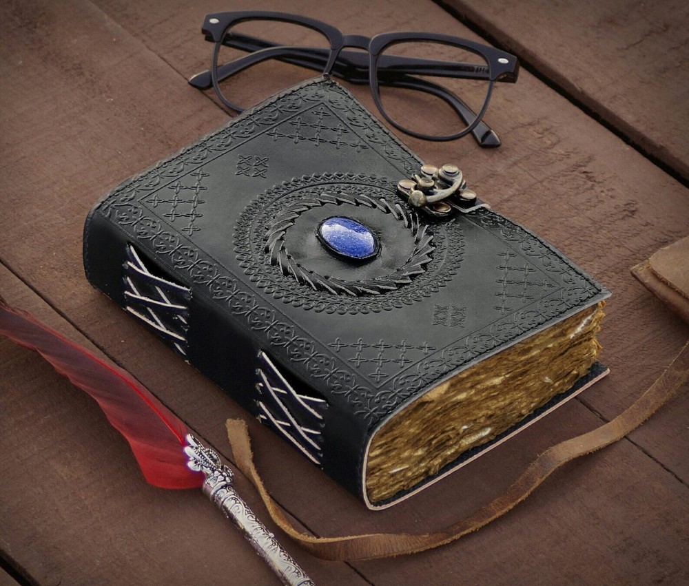 This is a luxury edition, limited edition leather journal made by a brand called "handmade". The journal has a cover made of leather and contains old paper with deckle edges. The journal is designed to be used as a book of shadows or for writing and journaling. It was manufactured in India. Beautiful Embossed • Lapis Lazuli Stone • Size - 7×5 inches • Color - Black & reddish brown • C-Lock brass • Genuine buffalo leather • Vintage deckle edge old paper • handmade rustic cotton paper • 100 Sheet (200 pages both side) ● Antique Paper - Vintage Journal is made of unique vintage paper which looks like it was pulled from history. You will love the old looking handmade cotton paper (200 pages) which is unique to our vintage journals. ● EXQUISITE & UNIQUE SEMI PRECIOUS STONE:The vintage journal is embossed with a special stone called “lapis lazuli” which helps to reveal inner truth within yourself and encourage self-awareness and self expression. We have taken extra to make sure that the emboss is perfect in every piece. ● VINTAGE LOCK AND STURDY BINDING - The vintage lock will keep all your valuable writing locked inside.Sturdy hand stitched binding to make sure that no paper comes out loose from your vintage notebook. ● Use Any Kind Of Pen - Sketch, Doodle, Write on your journal notebook with a Calligraphy Pen Fountain Pen, Brush Pen, Ball Pen, Acrylic Colours, Watercolor and many more. ◆ {Multiple Uses} ● The vintage leather journal is a perfect sketchbook, drawing journal, great gift, book of shadows, grimoire journal , wicca journal , calligraphy journal, story writing, scrapbook, art journal, leather sketchbook, travel journal, journals for women and many more. NOTE :- Due to screen resolution color of product may slightly vary from images shown. PAYMENT I accept Payoneer. COUNTRY : Shipping Worldwide from India TYPE : Standard Int'l Flat Rate Shipping I usually ship within 24 hours after receipt of payment. The delivery time from Ukraine: 10-25 days. Item will be qualitatively packed. Always leave a positive feedback to good ebayers