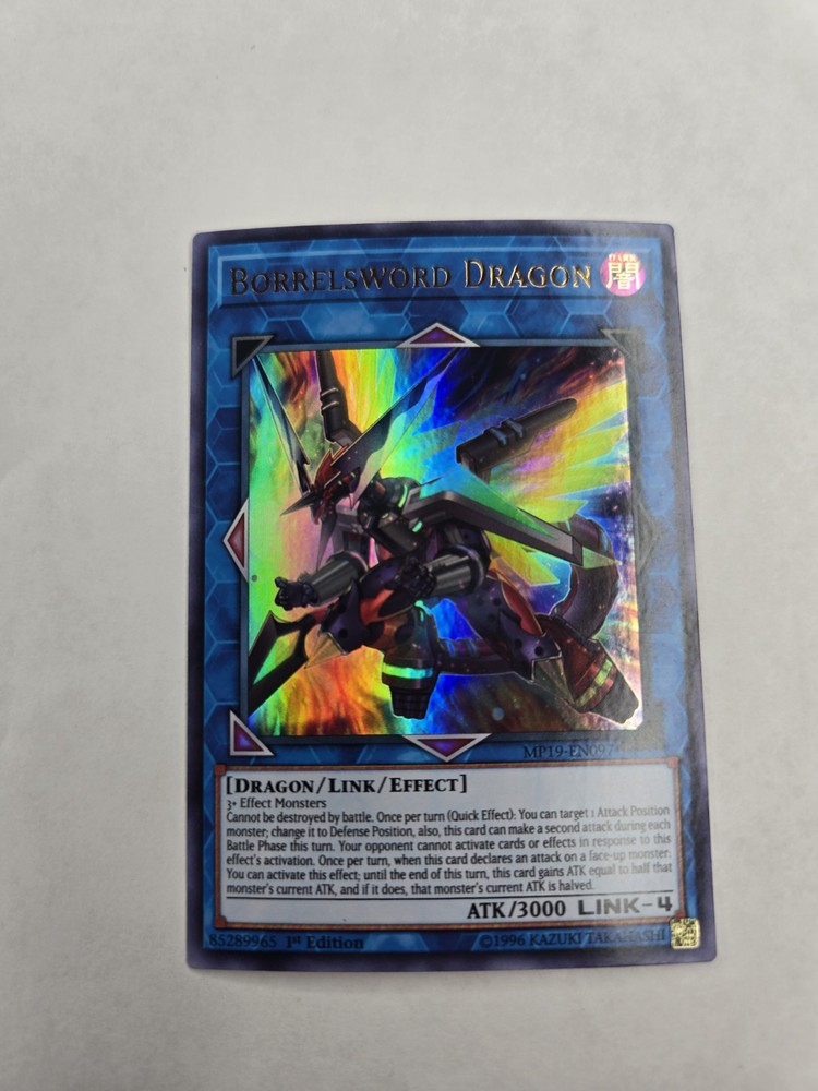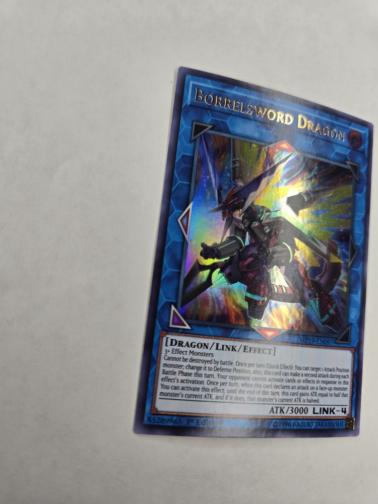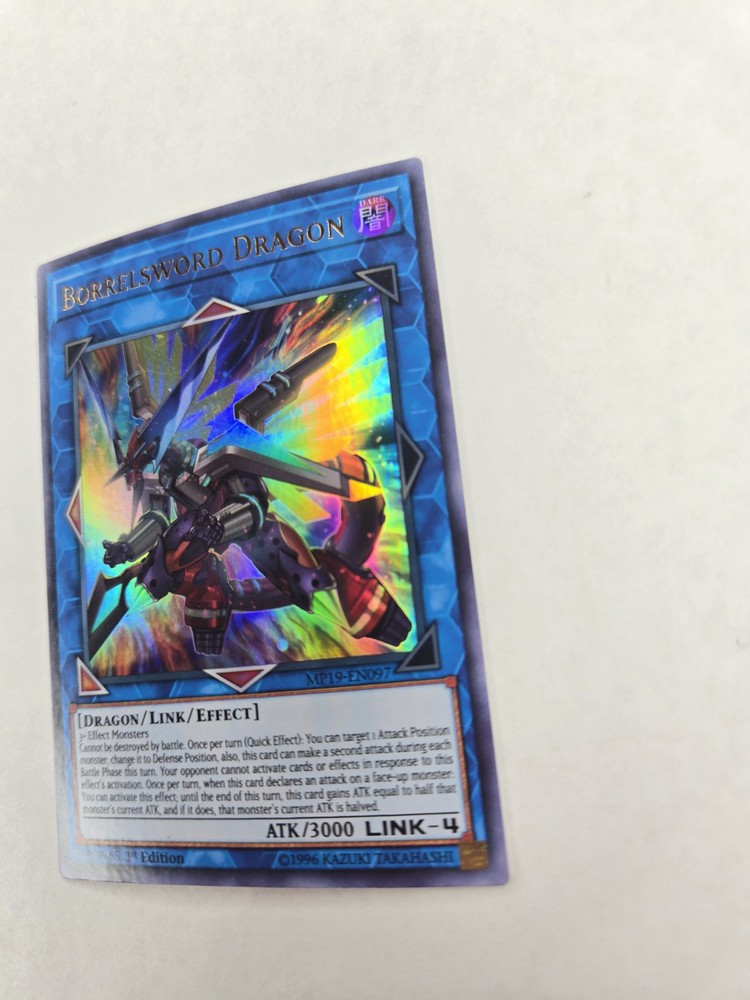 Penny sleeve and card saver included. Shipped USPS first class mail letter. Elevate your Yu-Gi-Oh! TCG collection with the formidable Borrelsword Dragon, a standout card from the 2019 Gold Sarcophagus Tin Mega Pack. Boasting the attribute of Dark, this Ultra Rare dragon-type monster with card number MP19-EN097 is a must-have for players and collectors alike, featuring a striking Holo finish that brings its vivid artwork to life. This Effect, Link card with an attack power of 3000 can be a game-changer, giving you an edge in battle. The Borrelsword Dragon is in English and remains in its Unlimited form, as it is not graded or autographed. Crafted by Konami, it's an essential piece for those looking to enhance their decks or preserve a piece of Yu-Gi-Oh! history.