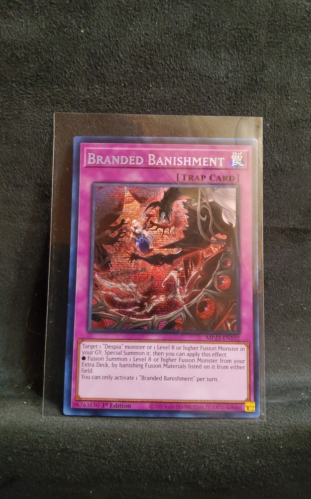 Branded Banishment is a 1st Edition Prismatic Secret Rare Trap-Normal card from the Yu-Gi-Oh! TCG 25th Anniversary Tin: Dueling Heroes Mega Pack. It features the Hero Creature/Monster Type and falls under the English language. Manufactured by Konami, the card number is MP23-EN102.
