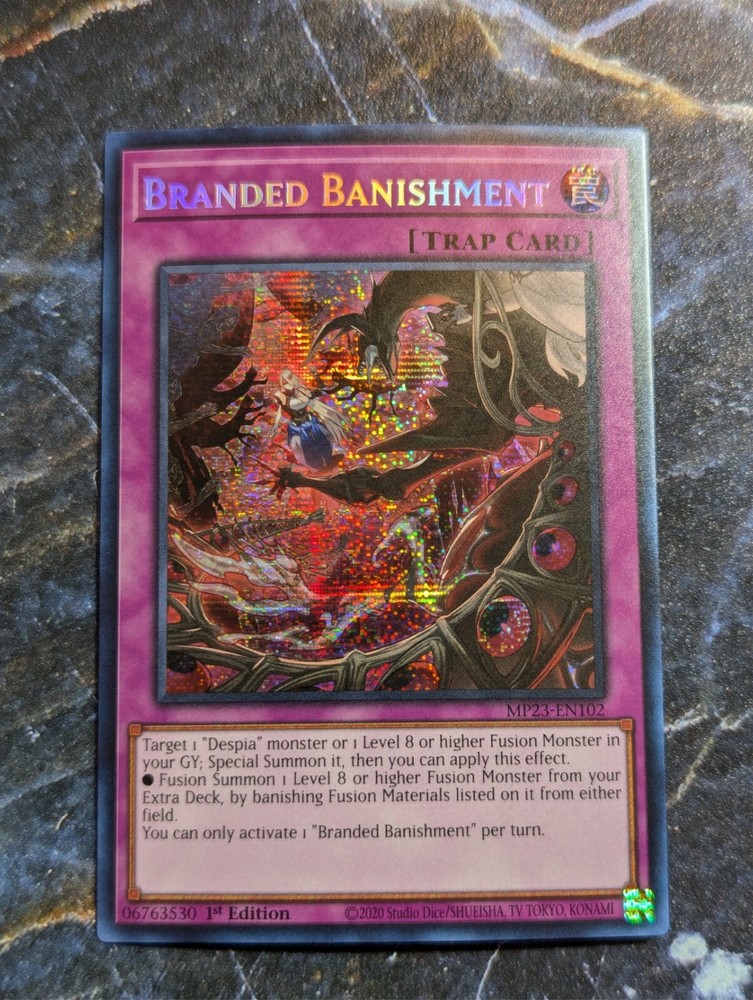 This is a highly sought-after Branded Banishment card from the Yu-Gi-Oh! TCG game. It is a Prismatic Secret Rare card with a Trap-Normal card type and a card number of MP23-EN102. The card is in English language and manufactured by Konami. This item is part of the 25th Anniversary Tin: Dueling Heroes Mega Pack set and features a 1st Edition design. Perfect for collectors and players alike, this card is sure to be a valuable addition to any collection.