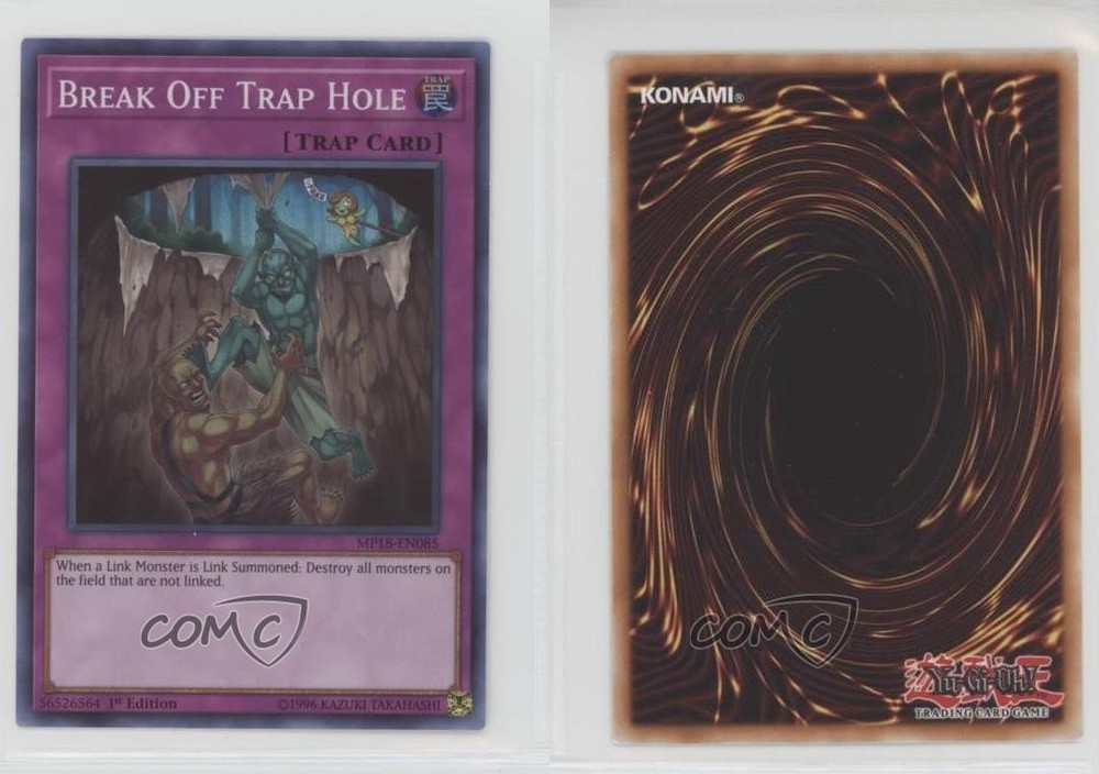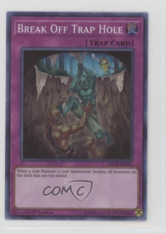 2018 Yu-Gi-Oh! Mega-Tins - Mega Pack [Base] - 1st Edition #MP18-EN085 Break off Trap Hole COMC Item: 172308594 - YuGiOh Card Search for more: 2018 Yu-Gi-Oh! Mega-Tins Search for more: 2018 Yu-Gi-Oh! Mega-Tins - Mega Pack [Base] - 1st Edition View all of our Listings Auctions Buy It Now About Us Located in the beautiful Pacific Northwest, COMC (Check Out My Cards) is the world's largest consignment service for trading card singles. More than 10,000 people have used our consignment service to list over 50 million trading cards. Find out how we can help you consign your items on eBay by contacting us through eBay messaging. COMC -- "The Safe & Easy Way to Buy & Sell" Raw Condition for Modern Cards Unless otherwise noted, raw modern cards are listed in Near Mint-Mint condition or better. A NM-MT card appears to be Mint at first glance, but upon closer inspection, may exhibit some of the following: minor print defects (e.g. roller marks, print line, dimple), minor scratches, slight edge wear, and slight corner wear. Centering is clearly visible in the images provided and does not factor into our condition assessment. Raw Condition for Vintage Cards Unless otherwise noted, raw vintage cards are listed in Excellent condition or better. An EX card may exhibit some of the following: minor rounding of corners, surface wear, print defects, light scratches, and slight edge wear/chipping. Centering is clearly visible in the images provided and does not factor into our condition assessment. Domestic Shipping Combined shipping for multiple items is available. To receive combined shipping, please ensure all desired items are in your eBay shopping cart before proceeding to checkout. eBay limits orders to 40 items per order. We automatically combine multiple orders placed on the same day. If you place multiple orders on the same day, please contact us to request a refund of applicable shipping costs. Signature confirmation may be required on invoices over $400. All cards are protected and shipped securely. International Shipping COMC offers eBay's International Shipping (EIS) for international orders under $2,500* (see country exceptions below). All duties and import fees are paid at checkout; in the rare event that there are additional import fees upon delivery, these are borne by the buyer. EIS packages route through a shipping hub in Erlanger, KY before shipping to their final destination. Please note that EIS does not allow for combined shipments. The shipping rates are determined by eBay and cannot be adjusted. *Maximum sale price exceptions: Colombia, Kuwait ($2,000); Taiwan ($1,539); Chile, Costa Rica, Guatemala, Honduras, Trinidad and Tobago ($1,000); Antigua and Barbuda, Aruba, Belize, Dominica, Grenada, Philippines, Saint Kitts and Nevis, Saint Lucia, Montserrat, Turks and Caicos Islands ($500); Dominican Republic, El Salvador ($200). Please request a shipping quote through eBay messaging for orders that exceed the maximum sale price supported by eBay's International Shipping. You will be responsible for all duties and import fees for international orders shipped outside the EIS. All cards are protected and shipped securely. Payment COMC does not accept offers on our cards through our eBay storefront. COMC utilizes eBay’s managed payments system. If you are experiencing difficulties making a payment, please contact eBay for assistance. Return Policy Returns are only accepted on the rare occasion the item is not as described. If you are making a return, please initiate the return process through eBay so a mailing label can be provided for you. Prior to listing, our expert team carefully assessed this item to represent it accurately. Please review the description and high-definition images prior to purchasing to ensure this item meets your satisfaction. We welcome you to contact us if you have further questions about this item. Trust and Integrity COMC carefully assesses each item consigned to us to prevent fraudulent items from entering the marketplace. If you believe an item offered on COMC may be fraudulent, please contact us with details so we can investigate the issue. Items we determine are outside our supported items policy may be removed. Last Modified: 6/3/2025 5:44:14 AM PDT