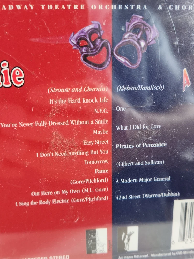 Ships SAME DAY or next business day! Broadway Showtunes SEALED CD Annie + A Chorus Line Broadway Theatre & Chorus Sealed 2 Digitally mastered soundtracks in 1 album Annie & A Chorus Line by The Broadway Theatre Orchestra & Chorus See photos for track titles