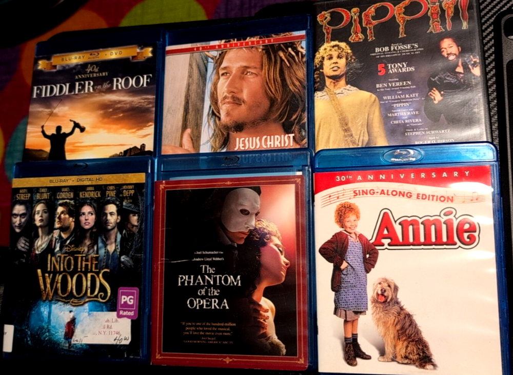 Broadway on Blu-ray & DVD! Lot of 6 Musicals - LIKE NEW Fiddler on the Roof, Jesus Christ Superstar, Pippin, Into The Woods, The Phantom of the Opera, Annie Bring the magic of the stage home with this fantastic lot of 6 musical film adaptations and rock operas on Blu-ray and DVD! This collection features a mix of beloved classics and iconic productions, perfect for any fan of musical theatre. This lot includes the following titles: Fiddler on the Roof (Blu-ray) Jesus Christ Superstar (Blu-ray) Pippin (DVD) Into The Woods (Blu-ray) The Phantom of the Opera (Blu-ray) Annie (Blu-ray) About the Movies: Fiddler on the Roof: Experience the timeless story of Tevye, a poor Jewish milkman, and his five daughters as they navigate tradition, love, and changing times in a Russian village on the eve of the revolution. Features classic songs like "Tradition," "Sunrise, Sunset," and "If I Were a Rich Man." This film adaptation won three Academy Awards. Jesus Christ Superstar: The iconic rock opera from Andrew Lloyd Webber and Tim Rice comes to life in this film version. Set against ancient locations, it tells the story of the final week of Jesus' life from the perspective of Judas Iscariot, featuring legendary songs like "Superstar" and "I Don't Know How to Love Him." Pippin: Stephen Schwartz's acclaimed musical about the son of Emperor Charlemagne searching for meaning and fulfillment. This production captures the unique blend of historical context and meta-theatrical storytelling, with memorable songs such as "Magic to Do" and "Corner of the Sky." Into The Woods: Stephen Sondheim's sophisticated musical weaving together characters from classic fairy tales like Little Red Riding Hood, Cinderella, Jack and the Beanstalk, and Rapunzel. The story explores what happens after "happily ever after," blending humor, darkness, and complex themes. The Phantom of the Opera: Andrew Lloyd Webber's globally renowned musical brought to the screen. A disfigured musical genius haunts the Paris Opera House and becomes obsessed with a young soprano. Known for its stunning score, including "The Phantom of the Opera" and "Music of the Night." Annie: The beloved story of an optimistic young orphan in New York City during the Great Depression who is chosen to spend a holiday with the wealthy industrialist Oliver Warbucks. Her cheerful outlook and search for her parents touch the hearts of everyone she meets. Features classic songs like "Tomorrow" and "It's the Hard-Knock Life." Condition: All movies in this lot are in like-new condition. The discs are free of scratches, and the cases are in excellent shape with no significant wear. Don't miss this opportunity to add these wonderful musical performances to your collection!