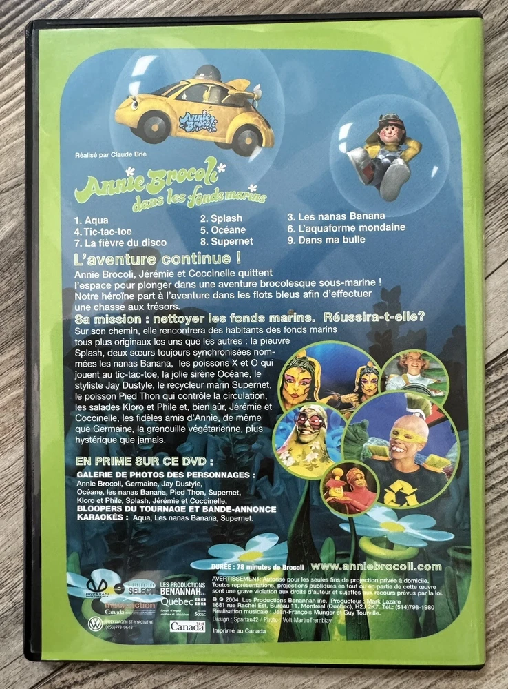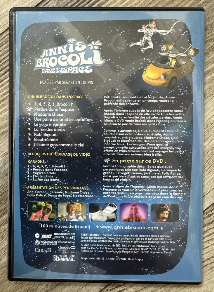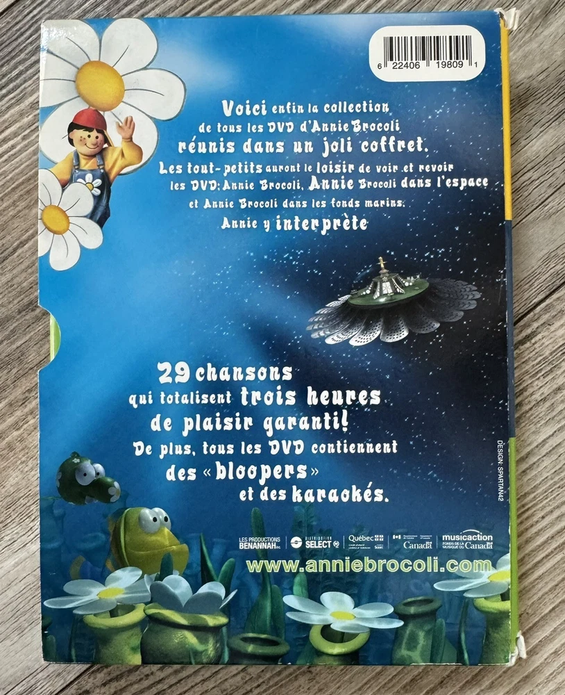 Broco Coffret - Annie Brocoli: Volume 1 (3 DVD Set) - (Version française) MINT!! The entire collection of Annie Brocoli’s videos is now available in a limited quantity on DVD. Following sales in excess of 10 times platinum on VHS both Annie Brocoli, and Annie Brocoli dans L’espace are available along with Annie Brocoli dans les fonds marins in this DVD Box Set. The collection includes Annie singing 29 of her favorite songs on the DVD’s for more than 3 hours of Broco-fun. In addition to the movies each of the DVD’s include karaoke and bloopers. As a special holiday bonus the box set will also include Annie Brocoli’s collection of original Christmas songs “Annie Brocoli Noel dans l’espace” to make a terrific holiday gift! READ MY OVER “2,000++!!!” REVIEWS ALL POSITIVE AND YOU WILL SEE I COMMUNICATE WELL - PACK WELL AND SHIP FAST! Sold ALMOST 6,000 Items!!! Just celebrated my 20 YEARS doing eBay - March 20, 2023 was when I started with eBay!! YOU ARE GETTING A LONG TERM VETERAN SELLER!!! PLUS YOU SEE WHAT YOU GET I DESCRIBE YOUR ITEM PERFECTLY!!! IN ADDITION, I HAVE OVER 200 + CUSTOMERS WHO CONSTANTLY BUY FROM ME AGAIN AND AGAIN & FOLLOW ME - THERE IS A REASON, AND THATS MY PRODUCT AND SERVICE! I NEVER USE STOCK IMAGES - YOU SEE EXACTLY WHAT YOU ARE GETTING!! ALSO I PRIDE MYSELF ON MY SHIPPING! I SHIP FAST AFTER IT IS PAID FOR EXCEPT IF IT FALLS ON THE WEEKEND I TRY NOT TO WORK AT LEAST ONE DAY BUT IT WILL SHIP MONDAY. IN ADDITION TO SHIPPING FAST I PRIDE MYSELF ON HOW WELL I PACK YOU CAN JUST READ MY REVIEWS! I PLACE EVERYTHING IN A WHITE PLASTIC BAG THEN I PUT A LOT OF PACKING AROUND YOUR ITEM TO PROTECT IT FOR A SAFE SHIPMENT! PLUS BEST OF ALL FREE SHIPPING!! HUGE PLUS ++++!! I NEVER EVER SHIP MY DISCS IN BUBBLE MAILERS!! NEVER!!!! THEY ALL GET SHIPPED IN A BOX FOR PROTECTION. NO MATTER YOU ARE BUYING ONE DISC OR MULTIPLE DISCS THEY ALL GET SHIPPED IN A BOX! PROTECTION IS MY GOAL AND I HAD A LOT OF CUSTOMERS COMPLIMENT ME THAT I SHIP MY DISCS IN BOXES!! I TOOK PICTURES OF ALL THE DISC SO YOU CAN SEE HOW PERFECT THE DISC IS. YOU ARE BASICALLY BUYING A NEW DVD! I EITHER SELL LIKE NEW DISCS OR BRAND NEW SEALED DISCS AND MY REVIEWS REFLECT THE QUALITY OF MY DISCS!!!! Summary: 3 DVD : Annie Brocoli, Annie Brocoli dans l’espace, Annie Brocoli dans les fonds marins. BONUS : le cd Noël dans l’espace. Disponible en quantité limitée, voilà enfin la collection de tous les DVD d’Annie Brocoli réunie dans un joli coffret. Les tout-petits auront le loisir de voir et revoir les DVD Annie Brocoli, Annie Brocoli dans l’espace et Annie Brocoli dans les fonds marins. La belle Annie y interprète 29 chansons qui totalisent trois heures de plaisir garanti! De plus, tous les DVD contiennent des « bloopers » et du karakoé. En prime, le cd Noël dans l’espace est offert et propose 13 chansons originales. Un cadeau idéal pour le temps des Fêtes!
