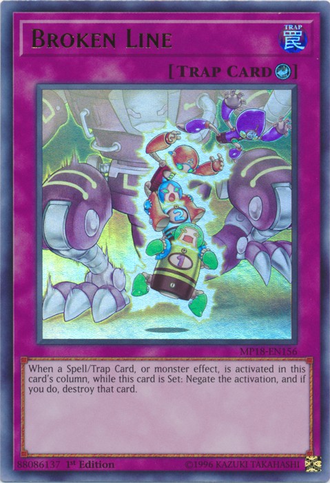 Broken Line - MP18-EN156 - Ultra Rare - 1st Edition Image is a stock photo of the card. You will receive the card in Moderately Played condition Condition: Moderately Played ATK/DEF : Attribute : Trap Card Number : MP18-EN156 Card Rules : Card Text : When a Spell/Trap Card, or monster effect, is activated in this card's column, while this card is Set: Negate the activation, and if you do, destroy that card. Card Type : CounterTrap Card Edition : 1st Level : Monster Type : Name : Broken Line Passcode : 88086137 Pendulum Scale : Rarity : Ultra Rare Set : 2018 Mega-Tin Mega Pack Be sure to visit our store for a wide selection of your favorite cards! We are running specials RIGHT NOW!! Shipping Options: ~Ships in a regular white envelope with a stamp for FREE! (THERE IS NO TRACKING INFORMATION AVAILABLE FOR THE ABOVE METHOD. SHIPPING TIME IS 4-10 BUSINESS DAYS) ~Ships in a TRACKEDbubble mailer for $5.99! ~Shipments are handled same or next business day. ~FREE SHIPPING for each additional card, so shop around our store!