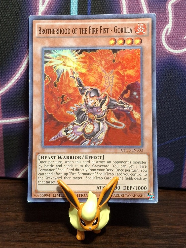 MP The product is a super rare Limited Edition card from the 2014 Mega-Tins set in the Yu-Gi-Oh! TCG game. The card, named Brotherhood of the Fire Fist - Gorilla, is a Fire attribute Beast-Warrior type card with 1600 Attack/Power and 1000 Defense/Toughness. It features unique abilities such as setting a "Fire Formation" Spell Card from the deck and targeting opponents' Spell/Trap Cards on the field. Manufactured by Konami, this English-language card is a valuable collectible for fans of the game.