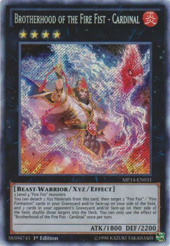 Please, carefully read the following: Image shown is a stock photo and does not reflect the actual card you will be receiving. Please refer to the condition guide below, the title and item description for what you will be receiving. Please also be aware that due to plastic shortages, orders may not always come in a plastic toploader but will always be protected as much as possible to prevent damage. You will receive 1x Brotherhood of the Fire Fist - Cardinal - MP14-EN031 - Secret Rare - 1st Edition - Condition: Near Mint Please refer to the Title and Item Description above for the item being purchased. Delivery delays: Deliveries may not always fall within the estimated delivery dates when shipping outside of Canada and USA. Many factors may contribute to delays in delivering the package such as weather and customs. Please note that delivery to international locations may take up to 8 weeks to arrive . We always ship out orders within 1 business day and after dropping off with the post office, delivery times are out of our control. Feedback: We will always leave positive feedback for you and we ask if you can do the same for us. If there is any reason why the transaction was not up to your expectations, please message us before leaving feedback so we can address the issue. Combined shipping: To receive a combined shipping quote, please make sure that you commit to purchasing on ebay.ca . This allows us to send you a combined shipping invoice before payment. Shipping within the USA (6-10 Business days): FREE! Shipping within Canada (3-8 Business days): FREE! Shipping and handling delay: We aim to ship all orders within 1 business day. We do not ship on weekends and holidays. Condition Guide: We do not sell any cards that are in MINT condition, the best condition that we offer is near mint. Near Mint (NM) - Cards in Near Mint condition show minimal to no wear from shuffling, play or handling and can have a nearly unmarked surface, crisp corners and unblemished edges outside of a few minimal flaws. A Near Mint card may have a tiny edge nick or a tiny scratch or two, but overall look nearly unplayed with no major defects or flaws. Lightly Played (LP) - Cards in Lightly Played condition may have minor border or corner wear or even just slight scuffs or scratches. There are no major defects such as water damage, bends or issues with the structural integrity of the card. Noticeable imperfections are okay, but none should be too severe or at too high a volume. Moderately Played (MP) - Cards in Moderately Played condition exhibit condition issues visible at a casual glance. Cards in Moderately Played condition can have border wear, corner wear, scratching or scuffing, creases or whitening, minor dirt buildup or any combination of mild examples of these marks. A Moderately Played card may have some form of a more major marking, such as spot water damage or creasing that doesnʼt affect card integrity, but not in combination with other issues such as scratches, scuffs or border/edge wear and not impacting a large area of the card. Heavily Played (HP) - Cards in Heavily Played condition show a severe amount of wear. Heavily Played condition can include cards that have major creasing, major whitening, major border wear or any combination of those flaws. (These flaws cannot prevent the card from being tournament playable when sleeved.) Damaged - Cards in Damaged condition can exhibit a tear, bend or crease that may make the card illegal for tournament play, even in a sleeve. Cards in Damaged condition may have extreme border wear, extreme corner wear, heavy scratching or scuffing, folds, creases or tears or other damages that impacts the structural integrity of the card.