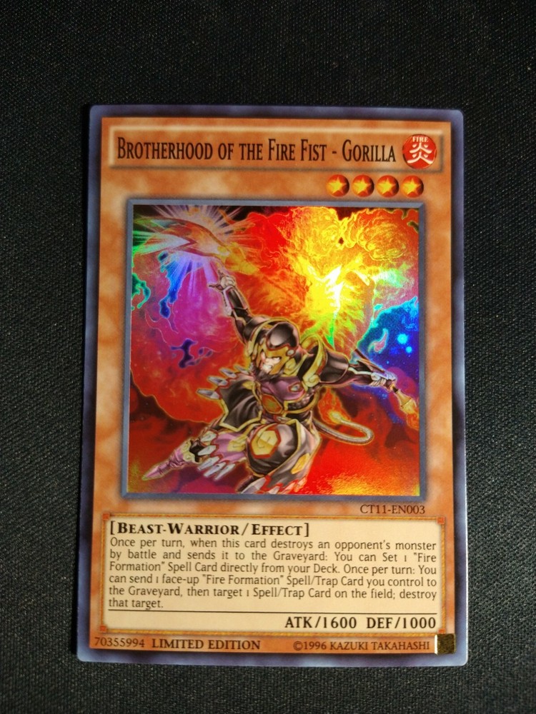 Brotherhood of the Fire Fist - Gorilla - CT11-EN003 - Super Rare - Limited Edition Image is a stock photo of the card. You will receive the card in Heavily Played condition Condition: Heavily Played ATK/DEF : 1600/1000 Attribute : Fire Card Number : CT11-EN003 Card Rules : Card Text : Once per turn, when this card destroys an opponent's monster by battle and sends it to the Graveyard: You can Set 1 "Fire Formation" Spell Card directly from your Deck. Once per turn: You can send 1 face-up "Fire Formation" Spell/Trap Card you control to the Graveyard to target 1 Spell/Trap Card on the field; destroy that target. Card Type : Effect Monster Edition : Limited Level : 4 Monster Type : Beast-Warrior Name : Brotherhood of the Fire Fist - Gorilla Passcode : 70355994 Pendulum Scale : Rarity : Super Rare Set : 2014 Mega-Tin Mega-Pack Be sure to visit our store for a wide selection of your favorite cards! We are running specials RIGHT NOW!! Shipping Options: ~Ships in a regular white envelope with a stamp for FREE! (THERE IS NO TRACKING INFORMATION AVAILABLE FOR THE ABOVE METHOD. SHIPPING TIME IS 4-10 BUSINESS DAYS) ~Ships in a TRACKEDbubble mailer for $5.99! ~Shipments are handled same or next business day. ~FREE SHIPPING for each additional card, so shop around our store!