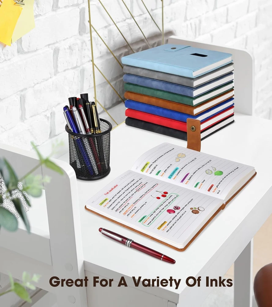 【VALUE OF MONEY HARDCOVER JOURNAL SET】: Classic brown ruled notebook, journals are elegant, quality crafted books available at a surprisingly competive price and quality. A huge choice for everyday use, provides plenty of space for notes, lists, musings, and more. And each notebook will give away a luxury pen, this is one of our best journal pens gifts. 【PREMIUM THICK PAPER】:5.9 X 8.4 inch journal notebook with 200 pages 100 gsm lined paper, thicker 30% than normal, this brown notebook is designed to avoid feathering and the paper is ink-proof, suit for most pens, but the wettest pen inks. Archival-quality pages made from acid-free paper-resists damage from light and air, the cream paper is easy on eyes.Let your creation more freedom on the wide ruled journal to write in. 【SOFT FAUX LEATHER JOURNAL NOTEBOOK】:This elegant Journal notebook has suede hardcover but feel soft in hand, just like a baby's skin. Fashion but reliable cover adapts to the movements of body without damage. The notebook's hard cover protects the pages inside and doubles as a convenient writing surface. Great gift for any. 【GUSSETED DESIGN】:Gusseted pocket design and cardboard bound cover, metal buckle helps keep notebook securely closed, making it easy to write in the notebook from just about anywhere. This notebook provide you a high quality writing experience. expandable gusseted pocket for stashing loose notes,business cards, receipts, mobile phone, or other small items. 【GREAT USE & PERFECT JOURNAL GIFTS】:Ideal for all office, school and home use,including for taking notes and keeping work in order,as a diary or journal for brainstorming ideas, creative writing or just doodling and drawing to your hearts content.This personalized journal notebook is a great birthday, mothers day, fathers day, children's day, graduation, christmas journal gifts. It is an ideal gift for mom,dad, teachers, wife, husband, friends, daughters, sons and granddaughter. Product Description VFAEJLL Journal Notebook Hardcover Leather Journal Notebook Soft Business PU Leather Diary Notebook A5 Journal Notebook Travelers Thicken School Office Meeting Record Notepad Handbook Gift Vintage Business Notebook Classic business simple atmosphere Retro texture fabric, innovative human design, thickened paper. Journal Notebook with Metal Signature Pen journal measures 5.9'' wide x 8.4'' high Unique cover gusseted pocket design Convenient pen insertion design, convenient application Silk ribbon with bookmarks for easy reference. Can record your diary, travel journal and note. Clear printing, soft and comfortable touch feeling, making you write smoothly and well. It is a great notebook for you to make everyday plan, making your things organized. Great for projects, writing lists, keeping notes and everyday use at home, office or school. Record your valuable thoughts, memories and experiences in this classic notebook. It is good for students, businessmen, teachers, professors and so on. Travel Journal Dream what you want to dream, go where you want to be, and be who you want to be. Because you only have one life and one chance to do all the things you want to do. A Wonderful Journal Gift Give a gift that communicates you value your loved one’s ideas. Luxury pen Using high quality steel penholder, high density, corrosion resistance, multi-layer piano paint surface, bright as new after long-term use, paint will not drop.Parker style refill supplied with black German Ink. Tip size: 0.5 mm. Perfect pen for journaling. Leather Notebook Cover with Elastic Pocket A5 Business notebook cover with pocket design, can be placed mobile phone, pen, etc.Copper fastener, business temperament, low-key atmosphere. High-quality sheepskin leather,soft and comfortable to the touch, and the texture is clearly visible. High Quality Writing Journal We use 100gsm thick paper, thicker than most other brands of paper, you can feel the quality and durability that make it one of our most popular writing journals, ensuring every page is resistant to ink bleeding, erasing , ghosting and shadows. High-density Ribbon Bookmark Durable, easy to mark and search 200 Pages Lined Paper he notebook has 200 pages with 20 lines on each page and 9mm spacing.