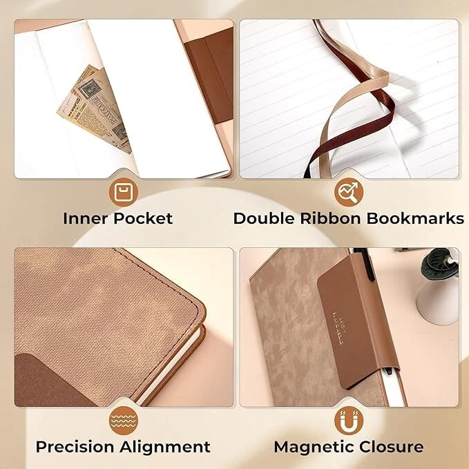 Exquisite Design: Our journaling notebooks featuring 100gsm ivory white acid-free paper, this leather journal notebook prevents ghosting and ink bleed-through. Includes wax paper packaging, dual ribbon bookmarks, an inner pocket, and a premium gift box for a luxurious touch. Comfortable Writing: Journals for writing With 256 pages of thick paper notebook, the B5 large notebook offers a smooth texture for effortless writing. Dual ribbons and a paper pocket add practicality for storing cards or small items. Sleek Functionality: A magnetic square closure replaces traditional straps, ensuring secure closure and doubling as a hidden pen loop. Perfect for on-the-go use with its B5 large notebook size and 180° flat-lay design. Perfect Gift: The elegant gift box, resembling a wrapped ribbon, makes this brown notebook an ideal gift for friends, writers, students, teachers, or professionals. Its premium design exudes sophistication. Durable & Eco-Friendly: The thick paper notebook resists humidity and temperature, ensuring long-lasting use. Acid-free paper promotes sustainability, making it a reliable choice for daily journaling or professional use. Excellent After-sales Service - We Have Your Back: We are dedicated to your satisfaction. If you have any questions or concerns about our B5 large lined journal for women, please reach out to us through Amazon messages. We value your feedback and will promptly provide a satisfactory response, as your satisfaction is crucial to our growth.