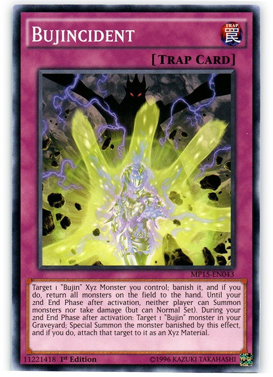 Bujincident - MP15-EN043 - Common - 1st Edition Image is a stock photo of the card. You will receive the card in Lightly Played condition Condition: Lightly Played ATK/DEF : Ability : Attack #1 : Attack #2 : Attack #3 : Attribute : Trap Card Number : MP15-EN043 Card Rules : Card Text : Target 1 "Bujin" Xyz Monster you control; banish it, and if you do, return all monsters on the field to the hand. Until your 2nd End Phase after activation, neither player can Summon monsters nor take damage (but can Normal Set). During your 2nd End Phase after activation: Target 1 "Bujin" monster in your Graveyard; Special Summon the monster banished by this effect, and if you do, attach that target to it as an Xyz Material. Card Type : Normal Trap Card Edition : 1st Finish : HP : Illustrator : Level : Manufacturer : Monster Type : Name : Bujincident Passcode : 11221418 Pendulum Scale : Rarity : Common Resistance : Retreat Cost : Set : 2018 Mega Tin Pack Stage : Weakness : Be sure to visit our store for a wide selection of your favorite cards! We are running specials RIGHT NOW!! Shipping Options: ~Ships in a regular white envelope with a stamp for FREE! (THERE IS NO TRACKING INFORMATION AVAILABLE FOR THE ABOVE METHOD. SHIPPING TIME IS 4-10 BUSINESS DAYS) ~Ships in a TRACKEDbubble mailer for $5.99! ~Shipments are handled same or next business day. ~FREE SHIPPING for each additional card, so shop around our store!