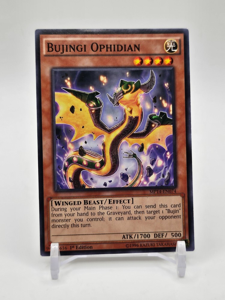 Elevate your Yu-Gi-Oh! TCG collection with the Bujingi Ophidian card from the 2014 Mega-Tins Mega Pack. As a 1st Edition card, it holds a special place for enthusiasts and collectors alike. With its striking winged beast design, this Effect-type card is a formidable addition to any deck, boasting an attack power of 1700 and a defense strength of 500. This common yet short print card, numbered MP14-EN074, features the Light attribute and comes in English language. Proudly manufactured by Konami, the Bujingi Ophidian embodies the intricate lore and strategic depth that the Yu-Gi-Oh! TCG is renowned for. Whether for play or display, this card is a must-have for fans of the game.