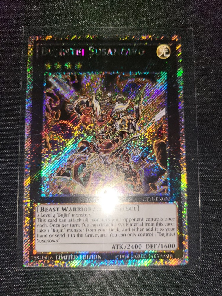 The Bujintei Susanowo CT11-EN002 card is a Secret Rare Yu-Gi-Oh! TCG collectible from the 2014 Mega-Tins set. Manufactured by Konami, this English-language card features a Light color attribute with an Attack/Power of 2400 and a Defense/Toughness of 1600. As a Beast-Warrior type Xyz and Effect card, Bujintei Susanowo offers a powerful gameplay experience for fans of the Yu-Gi-Oh! trading card game.