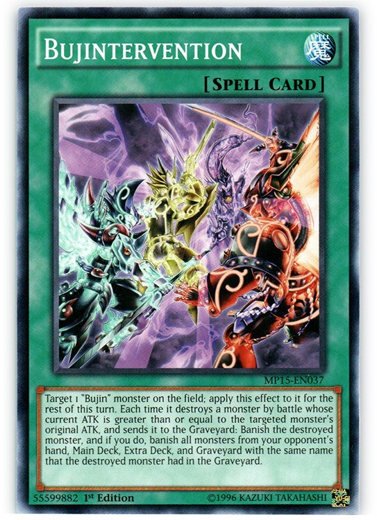 Bujintervention - MP15-EN037 - Common - 1st Edition Image is a stock photo of the card. You will receive the card in Moderately Played condition Condition: Moderately Played ATK/DEF : Ability : Attack #1 : Attack #2 : Attack #3 : Attribute : Spell Card Number : MP15-EN037 Card Rules : Card Text : Target 1 "Bujin" monster on the field; apply this effect to it for the rest of this turn. Each time it destroys a monster by battle whose current ATK is greater than or equal to the targeted monster's original ATK, and sends it to the Graveyard: Banish the destroyed monster, and if you do, banish all monsters from your opponent's hand, Main Deck, Extra Deck, and Graveyard with the same name that the destroyed monster had in the Graveyard. Card Type : Normal Spell Card Edition : 1st Finish : HP : Illustrator : Level : Manufacturer : Monster Type : Name : Bujintervention Passcode : 55599882 Pendulum Scale : Rarity : Common Resistance : Retreat Cost : Set : 2018 Mega Tin Pack Stage : Weakness : Be sure to visit our store for a wide selection of your favorite cards! We are running specials RIGHT NOW!! Shipping Options: ~Ships in a regular white envelope with a stamp for FREE! (THERE IS NO TRACKING INFORMATION AVAILABLE FOR THE ABOVE METHOD. SHIPPING TIME IS 4-10 BUSINESS DAYS) ~Shipments are handled same or next business day. ~ FREE SHIPPING for each additional card, so shop around our store!