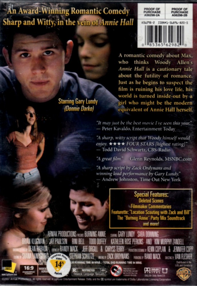 Dive into a barrel of laughter with the new DVD of "Burning Annie," featuring the comedic brilliance of Gary Lundy, Sara Downing, Kim Murphy, and Brian Klugman. Warned as a PG, this edition is perfectly suited for a wide audience looking to enjoy a light-hearted escape. This DVD is region-coded as 'PLAYABLE IN USA & CANADA - REGION 1' ensuring compatibility with players in North America. The audio is presented in English without the need for subtitles, as indicated by the 'ENGLISH LANGUAGE - NO MENTION OF SUBTITLES' feature. Please refer to the photos for the back cover details for additional information about the product. A college student and aspiring radio personality finds his obsession with Woody Allen's Annie Hall may be hindering his love life in director Van Flesher's heartfelt tribute to the master of the neurotic comedy drama. Max is a college student whose love of Annie Hall is beginning to border on unhealthy. Though his friends are quick to point out the main hurdle preventing Max from connecting with the opposite sex, the obsessive cinephile himself is in a constant state of denial. When Julie, the one and only fan of Max's late-night radio show, begins to take a romantic interest in Max, it finally dawns on the lovelorn broadcaster just how wild he has allowed his rampant film fanaticism to run. Now, in order to find true love, the man who loved Annie Hall will be forced to kiss his fictional sweetheart goodbye and take a chance on real life.