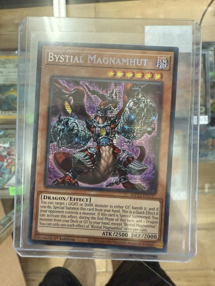 Unleash the power of Bystial Magnamhut, a formidable addition to your Yu-Gi-Oh! TCG arsenal from the 25th Anniversary Tin: Dueling Heroes Mega Pack. With its Prismatic Secret Rare rarity, this Effect-type card is a must-have for collectors and competitive players alike. Its impressive 2500 attack power and 2000 defense toughness make it a force to be reckoned with on the battlefield. Card Number MP23-EN157 represents its unique identity in the game, and as a 1st Edition release, it holds a special place for enthusiasts. The card is presented in English and manufactured by Konami, ensuring quality and authenticity. The dark attribute amplifies its mystique, making it a standout piece in any collection or deck.