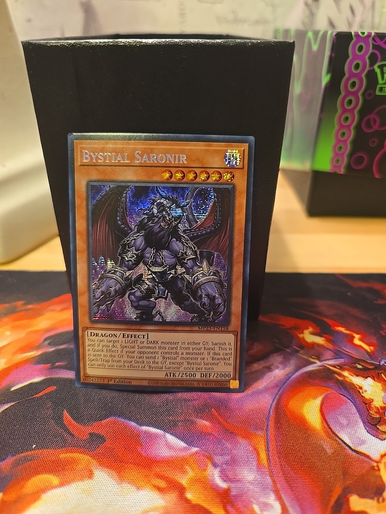 "Bystial Saronir" is a Dark Dragon monster card from the 25th Anniversary Tin: Dueling Heroes Mega Pack in the Yu-Gi-Oh! TCG. It has 2500 Attack and 2000 Defense. Its effect allows for special summoning from the hand, targeting and banishing monsters, as well as sending specific cards from the Deck to the Graveyard. This Prismatic Secret Rare card is Level 6 and features 1st Edition printing.