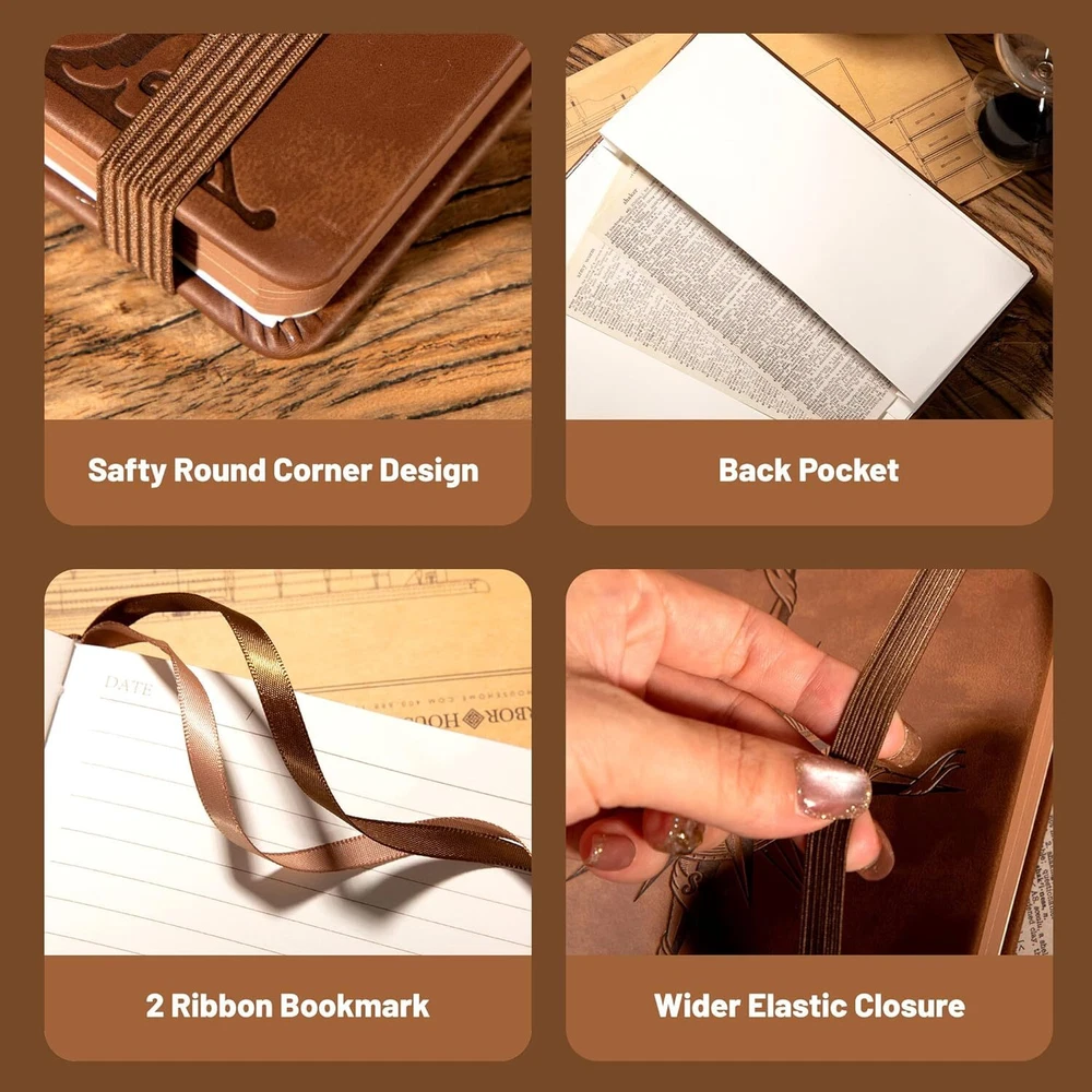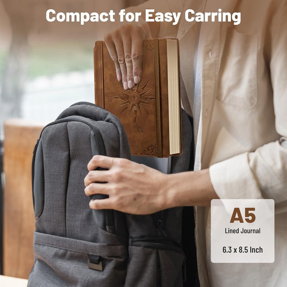 Free eBay listing template designed by dewiso.com CAGIE Compass Leather Notebook Journal for Men, 100 GSM 288 Pages Lined Journals for Writing, A5 Hardcover Journaling Notebooks Gift Set with Pen for Travel Office Daily Writing FREE AND FAST SHIPPING! About this item 【Vegan Leather Bound Journal】 : Vintage notebook with compass embossed, cruelty-free vegan leather cover, fine stitching, and unique spine as pen holder. 6.3"x8.5", compact for easy carry. 【Sturdy Binding】: Hardcover journal strong stitching process and extra layer of leather is sewn to prevent spine damage and pages falling out, The stitched leather on the spine can be used as a pen holder. 【Premium Quality Paper】: Daily journal features 100 gsm 288 pages of premium acid-free paper that prevents ink bleed, erasures, ghosting and shadows while protecting your eyes. 【180°Lay Flat Journal Notebook】: The writing journal 180° lay flat design makes writing easier, reading more convenient, and taking notes more efficient and making it easier to write for both right and left-handed users. 【Notebook Features】: Leather bound notebook has 2 Exquisite ribbon bookmarks to help you find content faster; 1 Elastic closure strap to keep the notebook closed; 1 leather stitched pen holder, can hold most pens; 1 Inner pocket for appointment cards, notes, receipts and more. 【Versatile Use】: Leather notebook is suitable for a variety of occasions, including work, reading, studying, journaling and personal use. this journaling notebook is a reliable companion for capturing ideas, taking notes and unleashing creativity. Product We offer a 30-Day Return Policy on items which you are not completely satisfied with. You have the option for a full-refund or an exchange of the item. No returns are available on items shipped outside of the US . Shipping We offer Free Shipping to the US and ship within 2 business days of payment, usually sooner. We use UPS express shipping. That's why your products are usually delivered within 3 days . Contact We try our very best to make sure every customer is completely satisfied. If there's a problem , message us! We're happy to help. 24/7 live chat available.