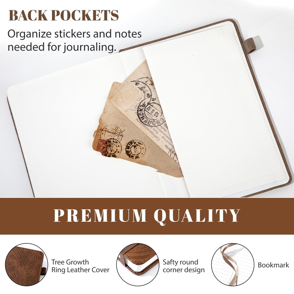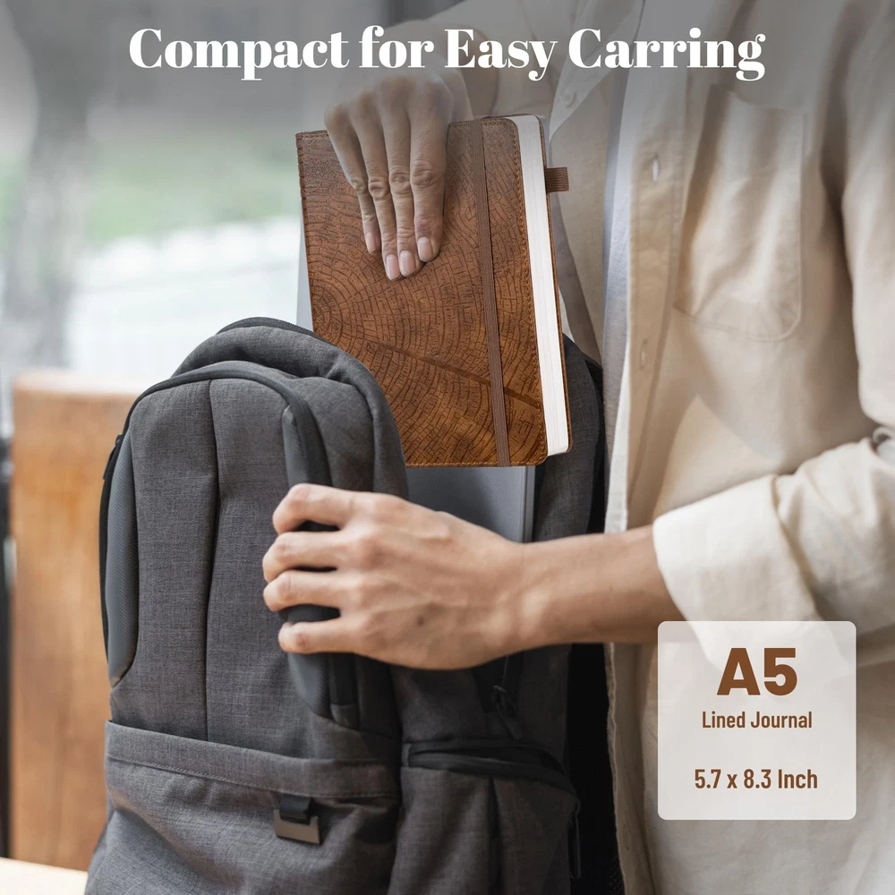 CAGIE Lined Journal for Men Women, Tree Growth Ring Leather Bound Journal Notebook, 256 Pages 100 GSM Journals for Writing, A5 Hardcover Journaling Notebooks for Work, Note Taking Product Details Color: Brwon Brand: CAGIE MPN: WL13-1 UPC: Does not apply EAN: Does not apply Brand: CAGIE Color: Brwon Theme: Embossed Tree Ring Pattern Cover Sheet Size: A5 Pages: 256 Pages Cover Material: Faux Leather Style: Embossed Tree Ring Pattern Cover Ruling Type: Ruled Special Feature: Embossed Tree Ring Pattern Cover, Pen Holder, Bookmark, 100 GSM Thick Paper, Hard Cover Product Dimensions: 5.7"L x 8.3"W x 0.9"Th Manufacturer: CAGIE Brand: CAGIE Item Weight: 1.06 pounds Product Dimensions: 5.7 x 8.3 x 0.9 inches Color: Brwon Cover Material: Faux Leather Number of Items: 1 Ruling: Ruled Sheet Size: A5 Manufacturer Part Number: WL13-1 Date First Available: August 6, 2024 Vegan Leather Bound Journal:The cover features a tree growth ring pattern, lightly embossed onto cruelty-free vegan leather. The textured cover adds visual interest and sets it apart from plain designs. The tree ring pattern represents personal growth, accomplishments, and the challenges along the way. 5.7 8.3 inches, compact and easy to carry Premium Quality Paper: Leather bound journal features 100 gsm 256 pages of premium acid-free paper that prevents ink bleed, erasures, ghosting and shadows while protecting your eyes. Hardcover notebook journal provides you with a good writing experience, So you can do a better job of writing or creatin Lay Flat Design: Our writing journal is designed to lay flat, making it easier to write with either hand, The elastic closure design helps protect your content. A ribbon bookmark inside makes it easy to keep track of queries and the pocket design for cards, receipts, or other small, scattered items, making it easy to organize your things Versatile Use: This A5 notebook is ideal for office, school and home use, and is a great gift choice for women, men, business executives, college, students and people in many other fields. This 5.7 x 8.3 inch journal can be carried around in a bag and is also a good helper for your travel records, meeting all your needs CAGIE Brand Support:You can purchase our products with full confidence! if you don't love the journal notebook due to any quality issues, simply contact us directly within 1 year and we will send you a hassle-free replacement journals for wroting or full refund