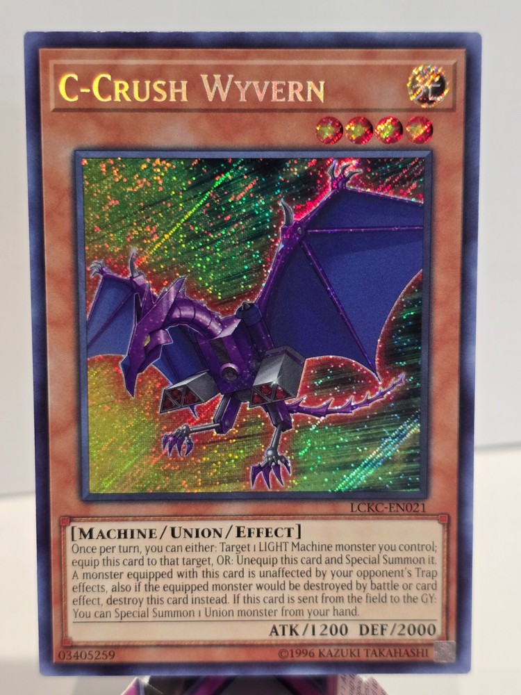 The C-Crush Wyvern card is a Light Attribute Machine creature card from the Yu-Gi-Oh Legendary Collection Kaiba-Unlimited Edition. With a Defense/Toughness of 2000 and an Attack/Power of 1200, this Secret Rare card is a valuable addition to any Yu-Gi-Oh! TCG collection. Manufactured by Konami, the card features unlimited availability and is classified as an Effect and Union type card. Its unique design and strategic gameplay make it a sought-after collectible for fans and players alike.