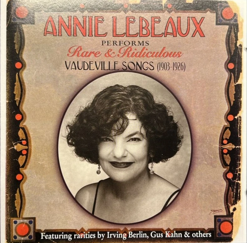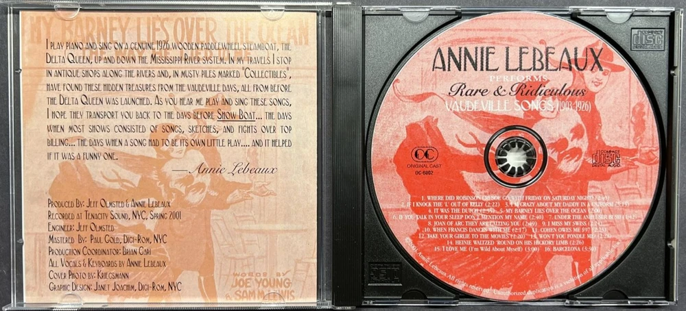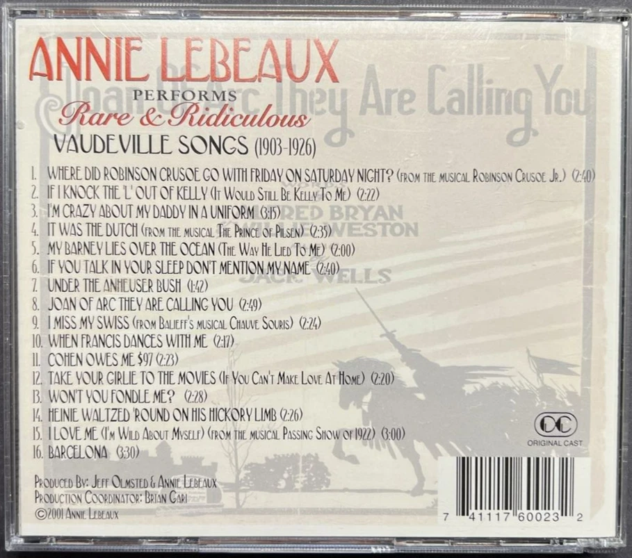 CD 2001, Annie Lebeaux - Performs Rare & Ridiculous Vaudeville Songs - VG! Shipping via USPS Media Mail (2-8 business days) More great CD's available - combine and save on shipping! Add all to Shopping Cart, then Request Total. Where Did Robinson Cursue Go With Friday On Saturday Night? 2:45 If I Knock The 'l Out Of Kelly (It Would Still Be Kelly To Me) 2:25 I'm Crazy About My Daddy In A Uniform 3:18 It Was The Dutch 2:40 My Barney Lies Over The Ocean (The Way He Lied To Me) 2:04 If You Talk In Your Sleep Don't Mention My Name 2:47 Under The Anheuser Bush 1:46 Joan Of Arc They Are Calling You 2:51 I Miss My Swiss 2:28 When Francis Dances With Me 2:20 Cohen Owes Me 2:27 Take Your Girlie To The Movies (If You Can't Make Love At Home) 2:23 Won't You Fondle Me? 2:29 Heinie Waltzed 'Round On His Hickory Limb 2:29 I Love Me (I'm Wild About Myself) 3:02 Barcelona 3:36