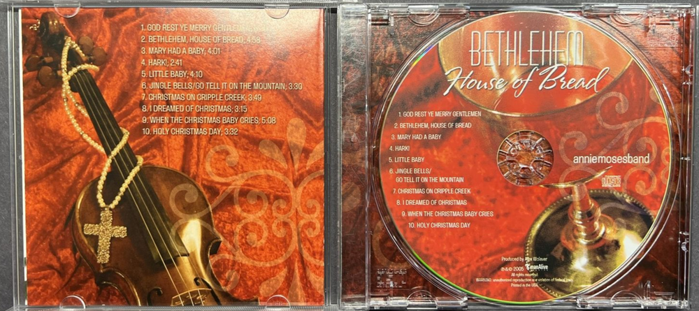 CD 2005, Annie Moses Band – Bethlehem - House Of Bread - Very Good! Shipping via USPS Media Mail (2-8 business days) More great CD's available - combine and save on shipping! Add all to Shopping Cart, then Request Total. 1 God Rest Ye Merry Gentlemen 2 Bethlehem, House Of Bread 3 Mary Had A Baby 4 Hark! 5 Little Baby 6 Jingle Bells / Go Tell It On The Mountain 7 Christmas On Cripple Creek 8 I Dreamed Of Christmas 9 When The Christmas Baby Cries 10 Holy Christmas Day