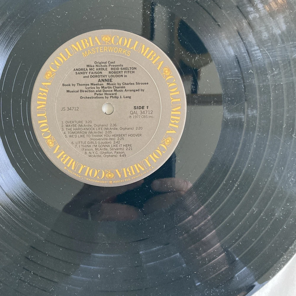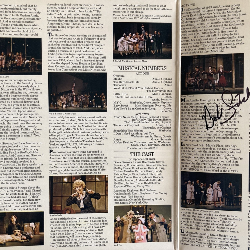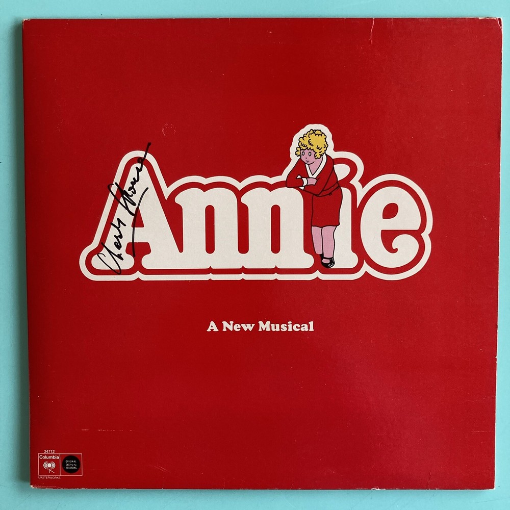 This is a signed vinyl LP of the original Broadway cast recording of "Annie" from 1977, featuring CHARLES STROUSE signature on the front cover. The record has scratches and Scuffs. It comes in a gatefold cover. It was released by Columbia Records and has a catalog number of 34712. The LP is in English and is a 33 RPM 12" record. The genre is Broadway. CHARLES STROUSE signed on the front cover in Black marker after an Encores performance of “Bye Bye Birdie “at City Center in NYC. ROBERT FITCH and Bob Freschi signed inside the gatefold cover.cover near images. ROBERT FITCH and Bob Freschi signed in Black marker. ROBERT FITCH signed his name as Bob FITCH. Bob FITCH and Bob Freschi signed after an Encores performance of “70, Girls, 70 “at City Center in NYC. The record has scratches and Scuffs.