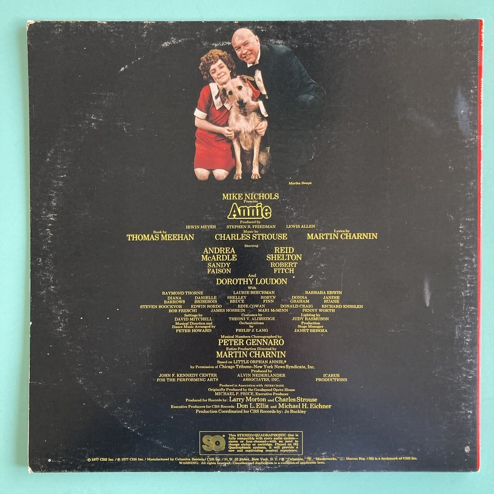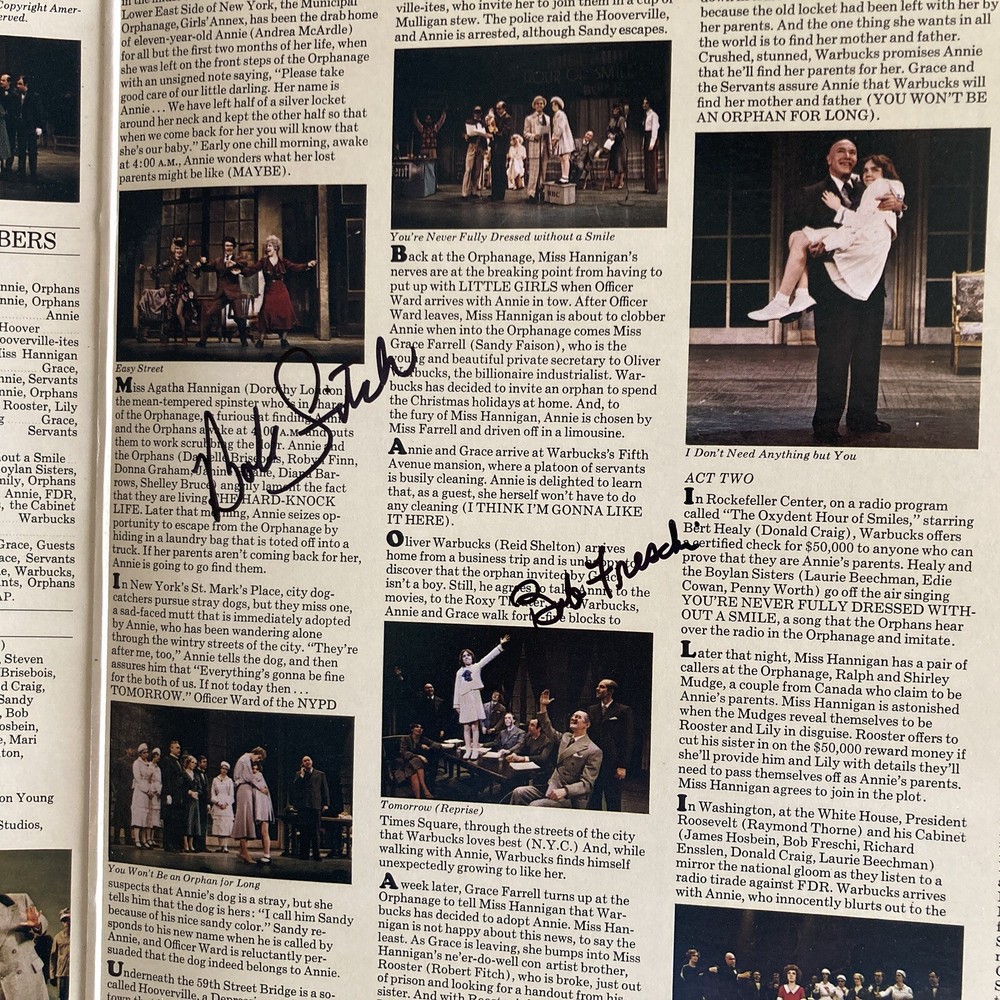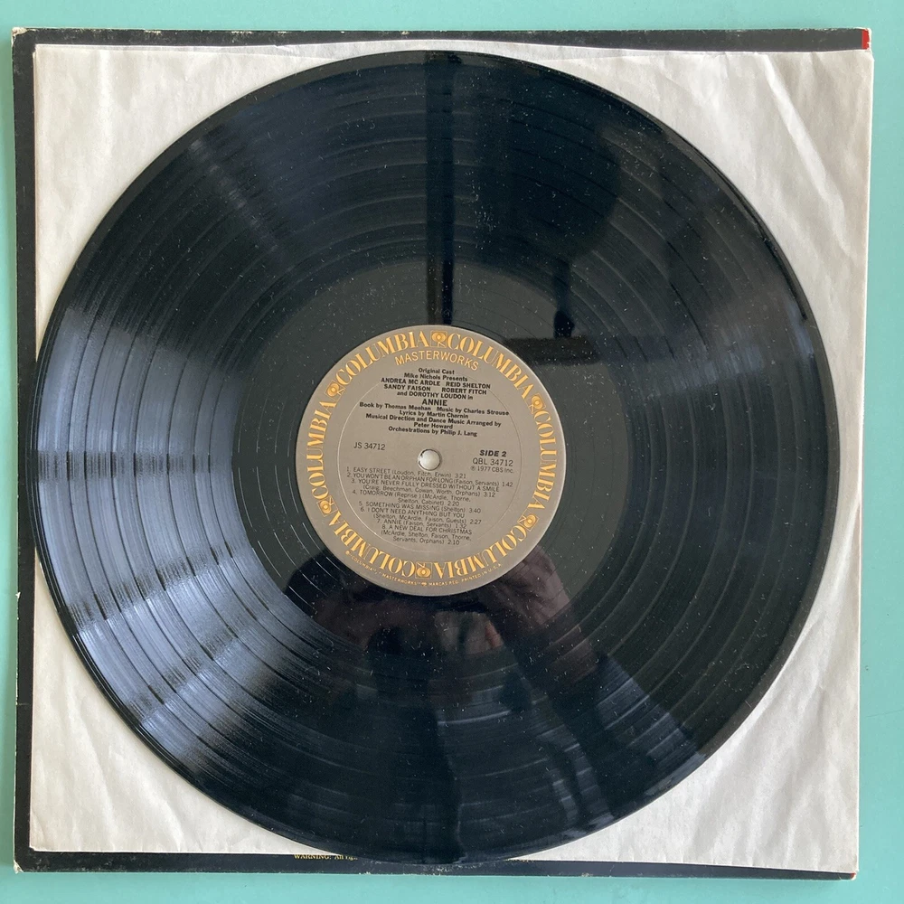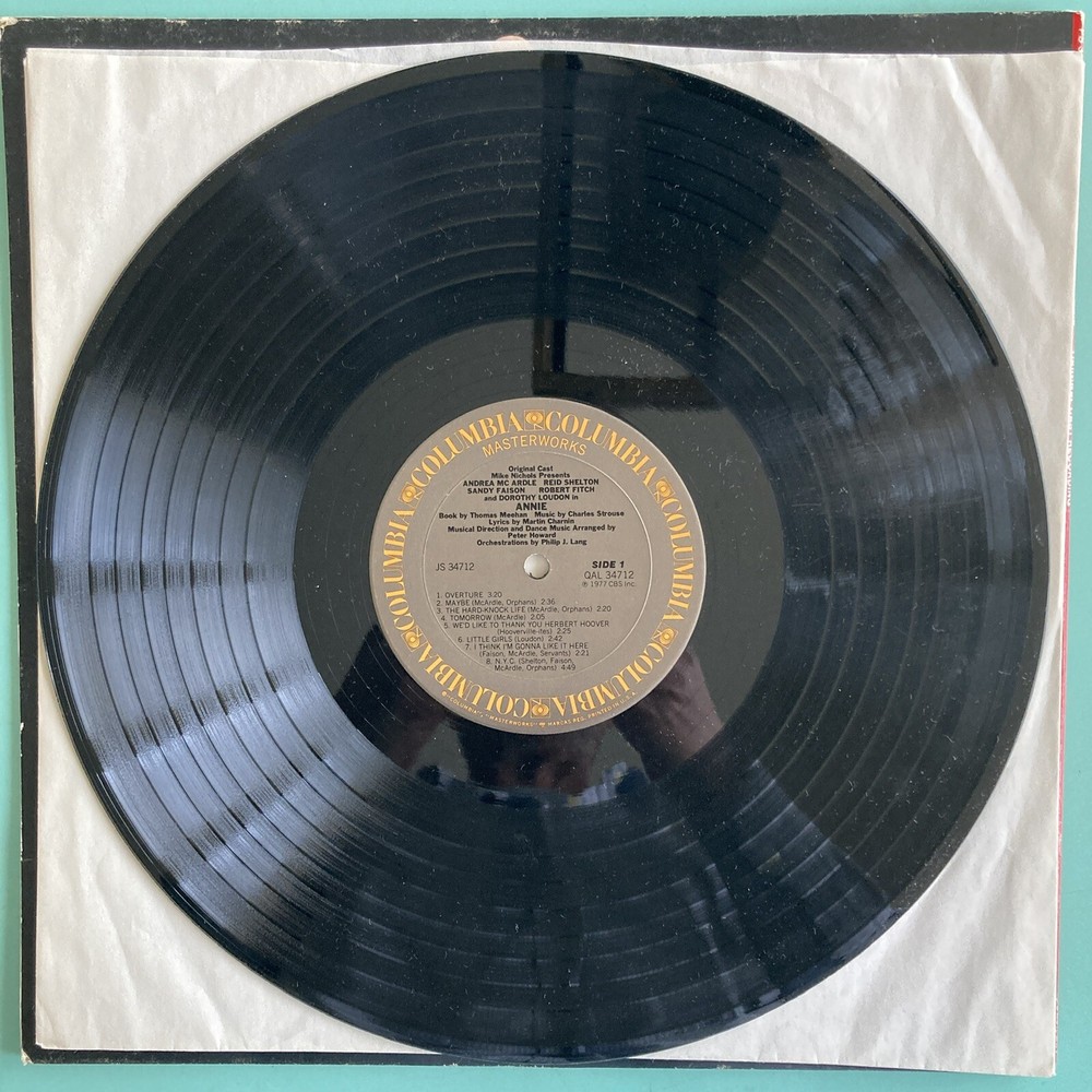 This is a signed vinyl LP of the original Broadway cast recording of "Annie" from 1977, featuring CHARLES STROUSE signature on the front cover. The record has scratches and Scuffs. It comes in a gatefold cover. It was released by Columbia Records and has a catalog number of 34712. The LP is in English and is a 33 RPM 12" record. The genre is Broadway. CHARLES STROUSE signed on the front cover in Black marker after an Encores performance of “Bye Bye Birdie “at City Center in NYC. ROBERT FITCH and Bob Freschi signed inside the gatefold cover.cover near images. ROBERT FITCH and Bob Freschi signed in Black marker. ROBERT FITCH signed his name as Bob FITCH. Bob FITCH and Bob Freschi signed after an Encores performance of “70, Girls, 70 “at City Center in NYC. The record has scratches and Scuffs.
