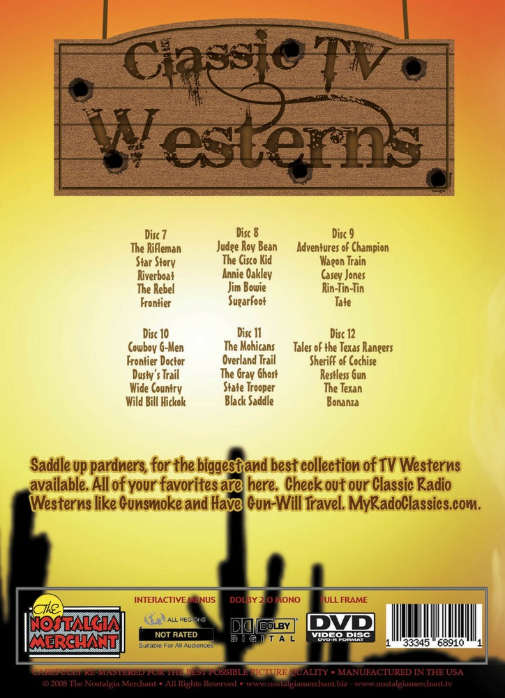 CLASSIC TV WESTERNS - VOL. 2 6 DVD-R Collectors Set Saddle up pardners, for the biggest and best collection of TV Westerns available. All of your favorites are here. See the episode list below. Volume two includes 30 Episodes in a 6 DVD set. All episodes are excellent quality. EPISODE TITLES: Disc 1 – The Rifleman, Star Story, Riverboat, The Rebel, Frontier; Disc 2 – Judge Roy Bean, The Cisco Kid, Annie Oakley, Jim Bowie, Sugarfoot; Disc 3 – Adventures of Champion, Wagon Train, Casey Jones, Rin-Tin-Tin, Tate; Disc 4 – Cowboy G-Men, Frontier Doctor, Dusty’s Trail, Wide Country, Wild Bill Hickok; Disc 5 – The Mohicans, Overland Trail, The Gray Ghost, State Trooper, Black Saddle; Disc 6 – Tales of the Texas Rangers, Sheriff of Cochise, Restless Gun, The Texan, Bonanza.