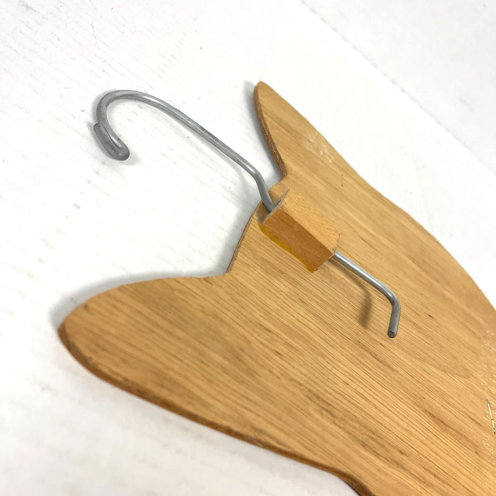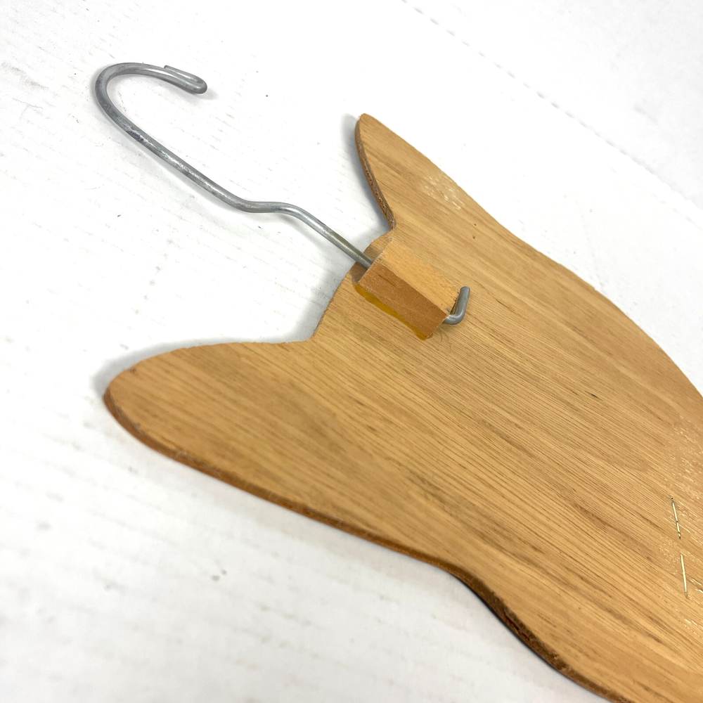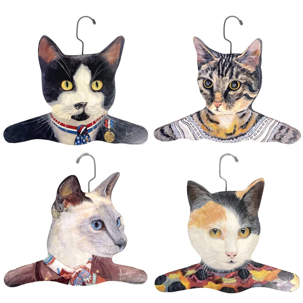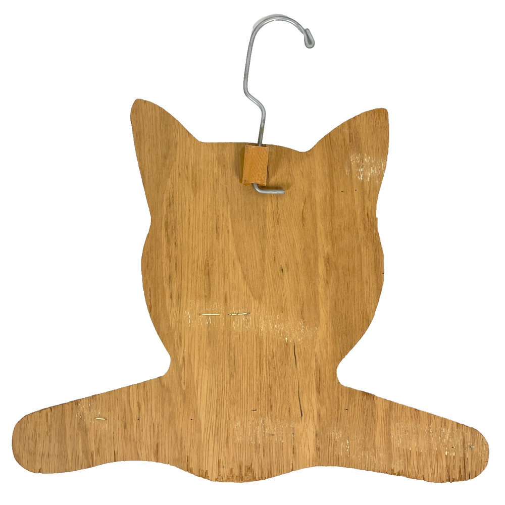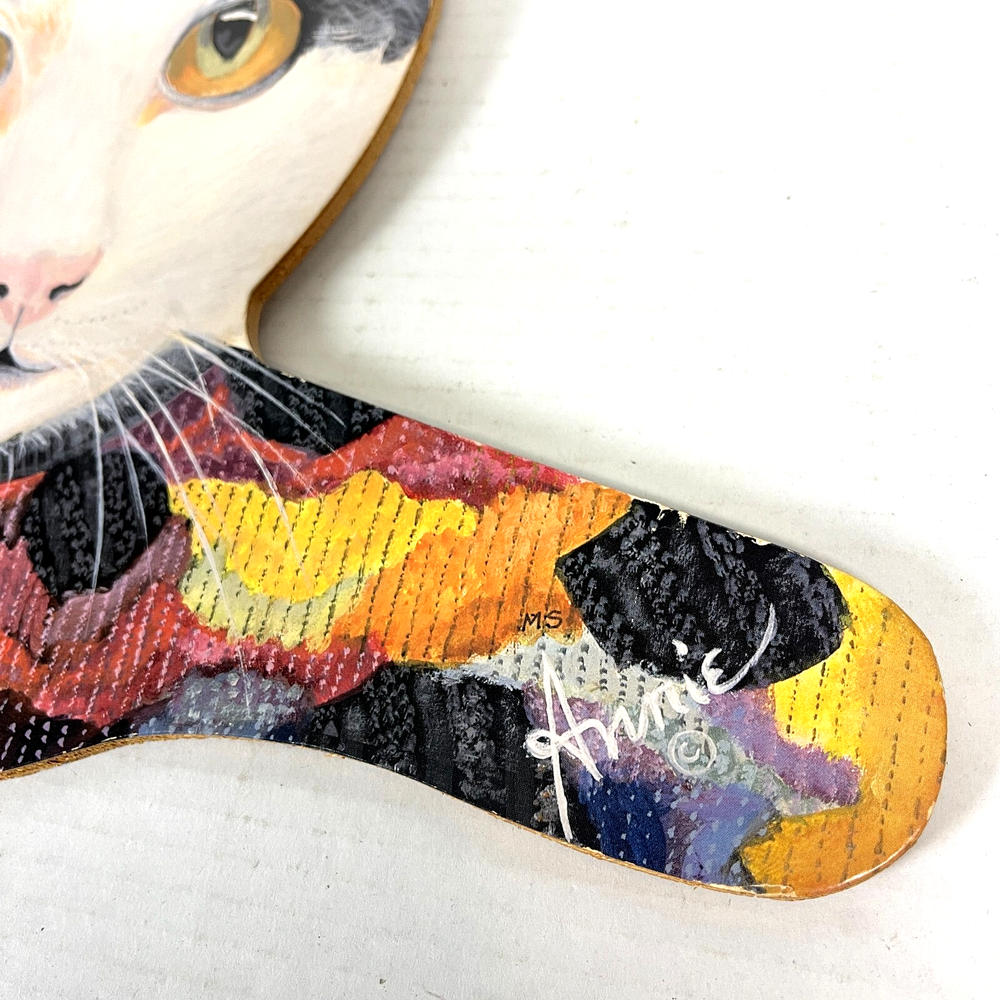 Vintage Cat Clothes Hanger (one) circa '80s-90s Calico cat w/mottled, camo patterned top jigsawed plywood w/decoupaged(?) cat illustration, metal hanger can completely rotate/swivel in all directions wood piece is aprx 12" tall; see pics for scale made in the USA by Stupell in Johnston, Rhode Island/ 401-831-5640 Part of a series of cat themed clothes hangers from Stupell, designed by Annie Rhinehart (we have four different ones for sale -all sold separately/ last photo shows all together but only first one is included in THIS sale) pre-owned, vintage condition w/minor cosmetic & edge wear w/ slight production imperfections