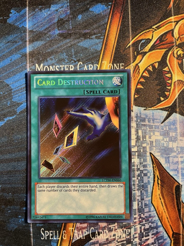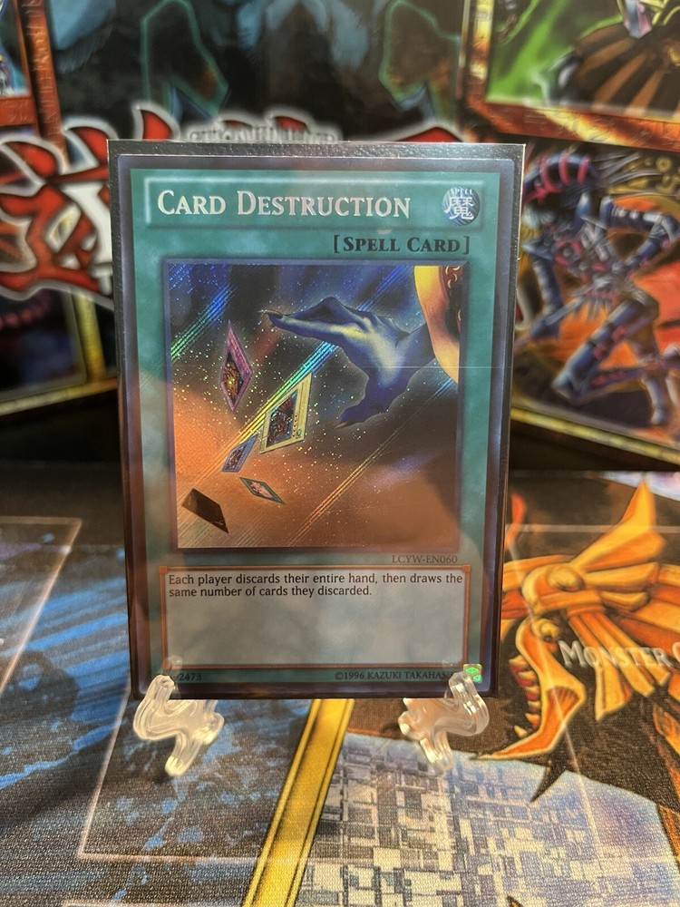This is a Secret Rare "Card Destruction" card from the Yu-Gi-Oh! TCG Legendary Collection 3: Yugi's World set. The card is in English, has a Holo finish, and is part of the Unlimited edition. Manufactured by Konami in the United States, this vintage card is highly sought after by collectors due to its rarity and association with the popular Yu-Gi-Oh! franchise. It does not feature an autograph and is card number LCYW-EN060.
