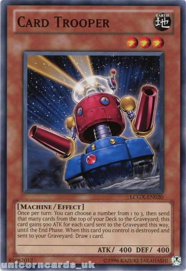 Card Trooper - LCGX-EN020 - Common - Unlimited Edition Image is a stock photo of the card. You will receive the card in Moderately Played condition Condition: Moderately Played ATK/DEF : 400/400 Ability : Attack #1 : Attack #2 : Attack #3 : Attribute : Earth Card Number : LCGX-EN020 Card Rules : Card Text : Once per turn, you can send up to 3 cards from the top of your Deck to the Graveyard. This card gains 500 ATK for each card sent to the Graveyard, until the End Phase. When this card you control is destroyed and sent to the Graveyard, draw 1 card. Card Type : Effect Monster Edition : Unlimited Finish : HP : Illustrator : Level : 3 Manufacturer : Monster Type : Machine Name : Card Trooper Passcode : 85087012 Pendulum Scale : Rarity : Common Resistance : Retreat Cost : Set : Legendary Collection 2 Stage : Weakness : Be sure to visit our store for a wide selection of your favorite cards! We are running specials RIGHT NOW!! Shipping Options: ~Ships in a regular white envelope with a stamp for FREE! (THERE IS NO TRACKING INFORMATION AVAILABLE FOR THE ABOVE METHOD. SHIPPING TIME IS 4-10 BUSINESS DAYS) ~Ships in a TRACKEDbubble mailer for $5.99! ~Shipments are handled same or next business day. ~FREE SHIPPING for each additional card, so shop around our store!
