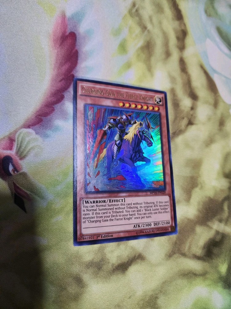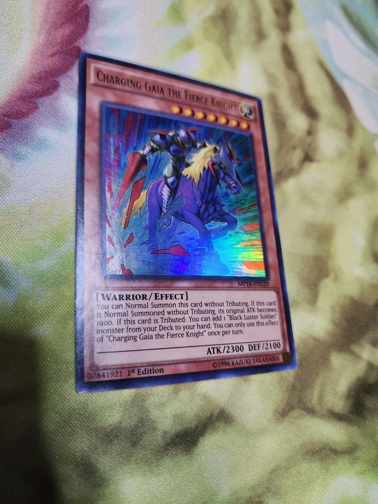 Unleash the power of Gaia with the "Charging Gaia the Fierce Knight" card, a formidable addition to your Yu-Gi-Oh! TCG arsenal. From the 2016 Mega-Tins Mega Pack, this Ultra Rare find boasts an impressive 2300 attack power and 2100 defense toughness, making it a force to be reckoned with on the battlefield. This card, numbered MP16-EN120, features the Warrior creature type and is presented in English. As a 1st Edition Effect card, it offers unique gameplay capabilities, including the ability to summon without Tributing or adding a "Black Luster Soldier" monster from your deck to your hand. Konami's craftsmanship ensures the quality and authenticity of this sought-after collectible.