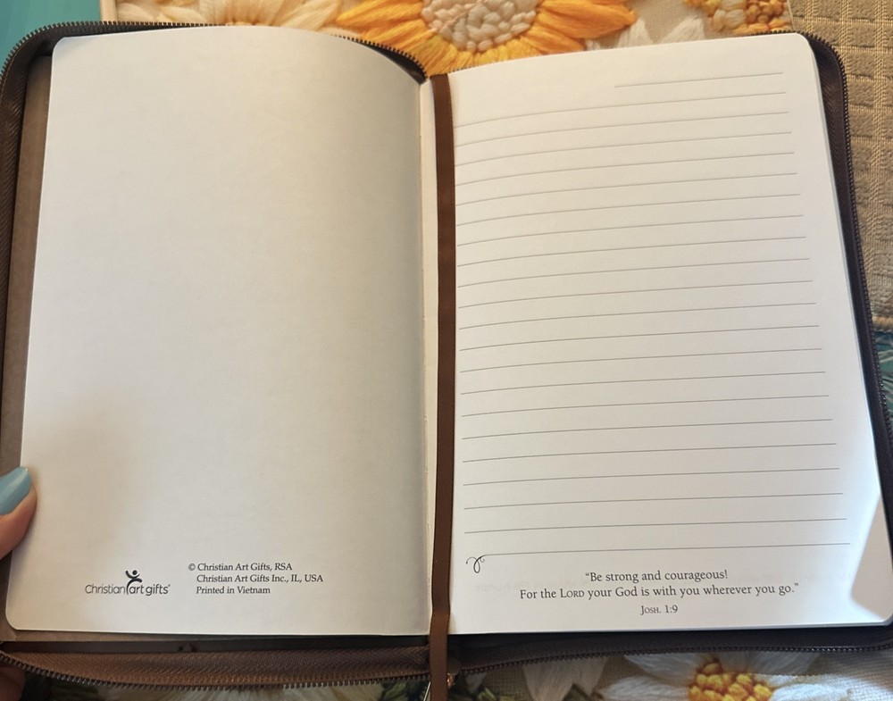 The Christian Leather Bound Journal by Christian Art Gifts is a stylish and durable notebook perfect for those looking to journal their faith and daily scripture readings. The leather cover adds a touch of sophistication, making it a great accessory for any office or personal space. With its timeless design and high-quality materials, this journal is a great choice for anyone seeking a reliable and beautiful writing instrument. New Zip shut Scripture from Jeremiah 29:11 is engraved into the decorative patch topstitched onto this rich brown Flexcover Journal. A design of Celtic influence is debossed onto the two-tone front, spine and back cover. The journal is covered in a quality man-made material with the look and feel of real leather (trade name LuxLeather), has a lay-flat spine and an attached ribbon page marker. Our writing journals are perfect for gift-giving, with a presentation page in the front. Each page carries an inspirational passage. 5.75 x 8.25 Inch - 336 Lined Pages