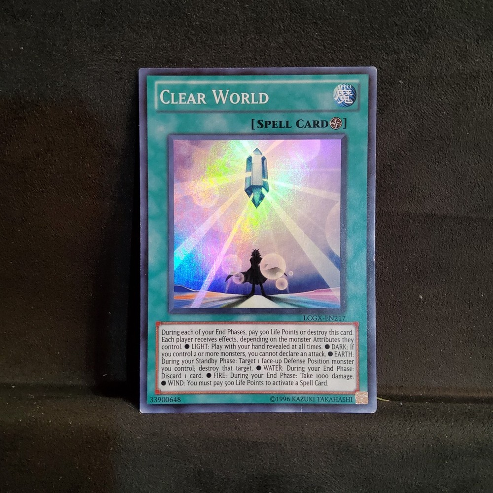 This Clear World card from the Yu-Gi-Oh! TCG is a Super Rare card with an Attack/Power of 0 and Defense/Toughness of 0. It belongs to the Legendary Collection 2: The Duel Academy Years set and has the Card Number LCGX-EN217. The card is in English language and manufactured by Konami. It features an Unlimited edition and is perfect for collectors of CCG Individual Cards. The card name is Clear World and it belongs to the Spell attribute in the game.