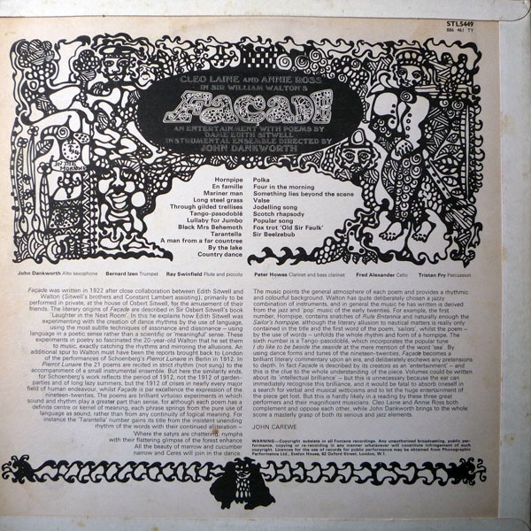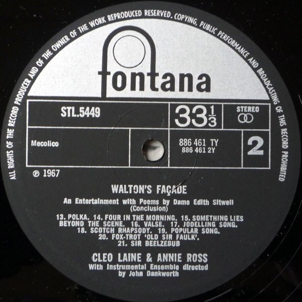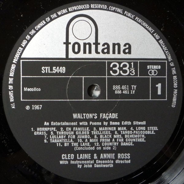 Cleo Laine & Annie Ross With John Dankworth, Walton's Façade, LP **STOCK IMAGES ARE USED** (Please read carefully) : Photos are imported from an online database and used to help you find the record you want. A jacket cover, picture sleeve, CD insert, poster, sticker, or other miscellaneous insert shown DOES NOT GUARANTEE it is included. PLEASE ASK BEFORE PURCHASE if anything shown in this listing will disappoint you if not included. Most of the time, if a special insert (poster, libretto, instruction booklet) or sleeve is included, it will be noted here in the comments specific to this listing: Comments specific to this listing: ***Record shows no obvious signs of wear. Cover is nice but may have small amount of writing or small sticker. *** Media Condition: Near Mint (NM or M-) Based on visual inspection. Album Cover -or- 7" Picture Sleeve (GENERIC = NONE) -or- CD Insert Condition: Very Good Plus (VG+) STOCK PHOTOS HAVE BEEN USED WITH LISTING: Photos shown have been pulled from an online database. A picture / company sleeve / CD insert in the photo does not guarantee it is included. If a record cover, picture sleeve or CD insert is included, its Condition will be filled in above this line. If "GENERIC" is specified in the condition grade above this paragraph, it means there is no album cover (LPs), or picture sleeve (7" 45rpm singles,) or CD insert. A poster, libretto, or other insert shown in the image is not a guarantee it is included, please ask before purchase. SPECIFICATIONS ARE AUTO-FILLED: If there is something specific you require, please ask us to confirm. We are happy to confirm catalog number, matrix numbers, label color, or any other distinguishing detail that will insure you receive what you expect. LIBRARY Copies: Records from library collections typically have well taken care of and great sounding vinyl. The album cover and sleeve are often stapled to a thick, clear vinyl cover. There is almost always a library stamp or inventory sticker on the label. These records will say "library copy" in the comments specific to the listing. RADIO TIMING STRIP: A large, white label on the jacket cover which provides timing information required when the record is played on air. If a Radio Timing Strip is present, it will be noted in the comments specific to this listing. POSTER, LIBRETTO, OTHER INSERT: A photo of an insert is not a guarantee it is included. Typically, if an insert is included we will mention it in the comments specific to this listing. Not always. Please ask before purchase if an insert is important to your enjoyment of the record. Thank you for having a look at our collection! Be sure to follow us so you're notified when we post new items. IMPORTANT NOTE: A picture sleeve or album cover in the stock photo of a vinyl record does not guarantee it is included with this item. If the vinyl record sleeve condition specifies "Generic" THERE IS NO PICTURE SLEEVE or RECORD JACKET (item will come in a company sleeve or plain sleeve.) Track List : A1. Hornpipe A2. En Famille A3. Mariner Man A4. Long Steel Grass A5. Through Gilded Trellises A6. Tango-Pasodoble A7. Lullaby For Jumbo A8. Black Mrs. Behemoth A9. Tarantella A10. A Man From A Far Countree A11. By The Lake A12. Country Dance B1. Polka B2. Four In The Morning B3. Someth