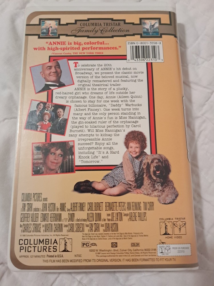 Experience the classic musical tale of Annie, brought to life in this Live-Action VHS edition. Starring an all-star cast and featuring breathtaking footage, this film is a must-see for fans of the genre. The VHS tape comes in a Clamshell edition, making it a unique addition to any collection. This movie is rated PG and is in English language, with a Signal Standard of NTSC. Released in 1997, it is a timeless classic that will transport you to a world of wonder and enchantment. From the studio of ColumbiaTristar, this VHS tape is sure to become a cherished item in your collection.