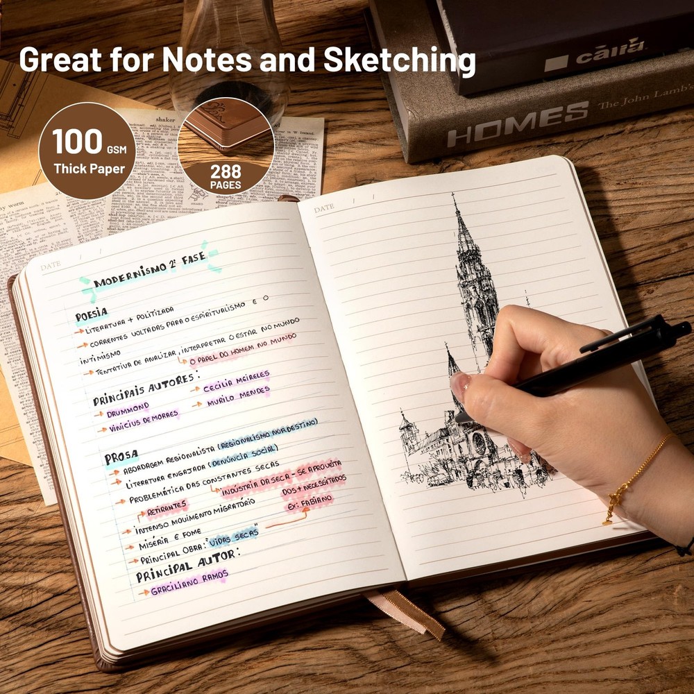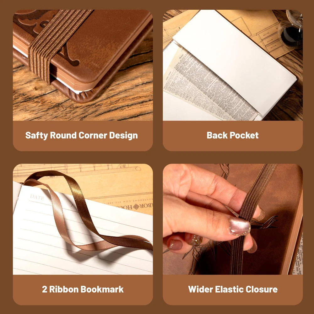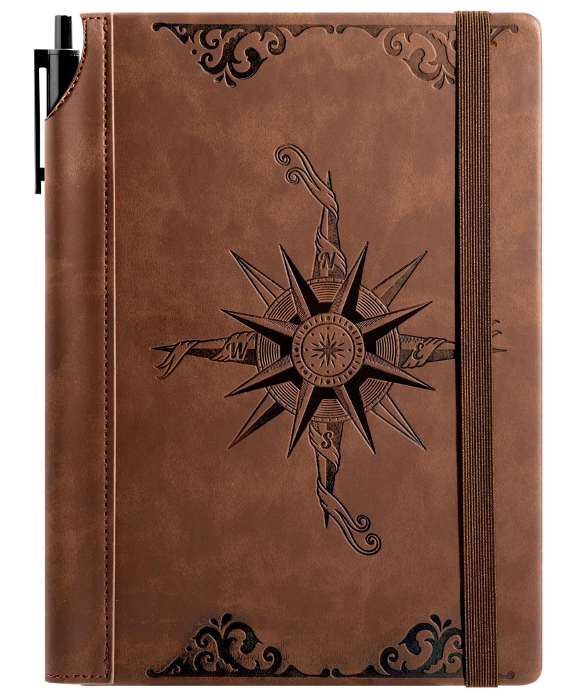 Compass Leather Notebook Journal for Men, 100 GSM 288 Pages Lined Journals for Writing, A5 Hardcover Journaling Notebooks Gift Set with Pen for Travel Office Daily Writing 【Vegan Leather Bound Journal】 : Vintage notebook with compass embossed, cruelty-free vegan leather cover, fine stitching, and unique spine as pen holder. 6.3"x8.5", compact for easy carry. 【Sturdy Binding】: Hardcover journal strong stitching process and extra layer of leather is sewn to prevent spine damage and pages falling out, The stitched leather on the spine can be used as a pen holder. 【Premium Quality Paper】: Daily journal features 100 gsm 288 pages of premium acid-free paper that prevents ink bleed, erasures, ghosting and shadows while protecting your eyes. 【180°Lay Flat Journal Notebook】: The writing journal 180° lay flat design makes writing easier, reading more convenient, and taking notes more efficient and making it easier to write for both right and left-handed users. 【Notebook Features】: Leather bound notebook has 2 Exquisite ribbon bookmarks to help you find content faster; 1 Elastic closure strap to keep the notebook closed; 1 leather stitched pen holder, can hold most pens; 1 Inner pocket for appointment cards, notes, receipts and more. 【Versatile Use】: Leather notebook is suitable for a variety of occasions, including work, reading, studying, journaling and personal use. this journaling notebook is a reliable companion for capturing ideas, taking notes and unleashing creativity.