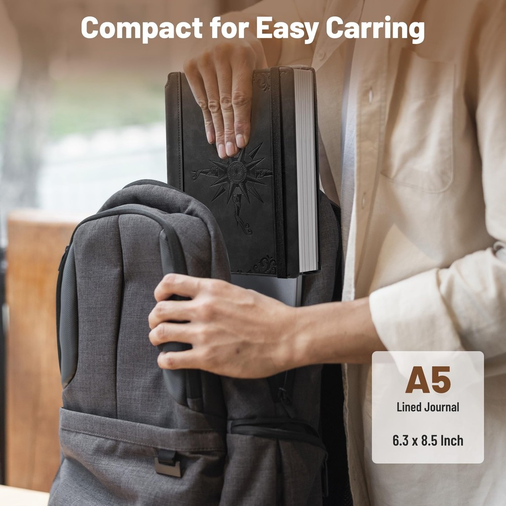 CAGIE Compass Leather Notebook Journal for Men, 100 GSM 288 Pages Lined Journals for Writing, A5 Hardcover Journaling Notebooks Gift Set with Pen for Travel Office Daily Writing 【Vegan Leather Bound Journal】 : Vintage notebook with compass embossed, cruelty-free vegan leather cover, fine stitching, and unique spine as pen holder. 6.3"x8.5", compact for easy carry. 【Sturdy Binding】: Hardcover journal strong stitching process and extra layer of leather is sewn to prevent spine damage and pages falling out, The stitched leather on the spine can be used as a pen holder. 【Premium Quality Paper】: Daily journal features 100 gsm288 pages of premium acid-free paper that prevents ink bleed, erasures, ghosting and shadows while protecting your eyes. 【180°Lay Flat Journal Notebook】: The writing journal 180° lay flat design makes writing easier, reading more convenient, and taking notes more efficient and making it easier to write for both right and left-handed users. 【Notebook Features】: Leather bound notebook has 2 Exquisite ribbon bookmarks to help you find content faster; 1 Elastic closure strap to keep the notebook closed; 1 leather stitched pen holder, can hold most pens; 1 Inner pocket for appointment cards, notes, receipts and more. 【Versatile Use】: Leather notebook is suitable for a variety of occasions, including work, reading, studying, journaling and personal use. this journaling notebook is a reliable companion for capturing ideas, taking notes and unleashing creativity.