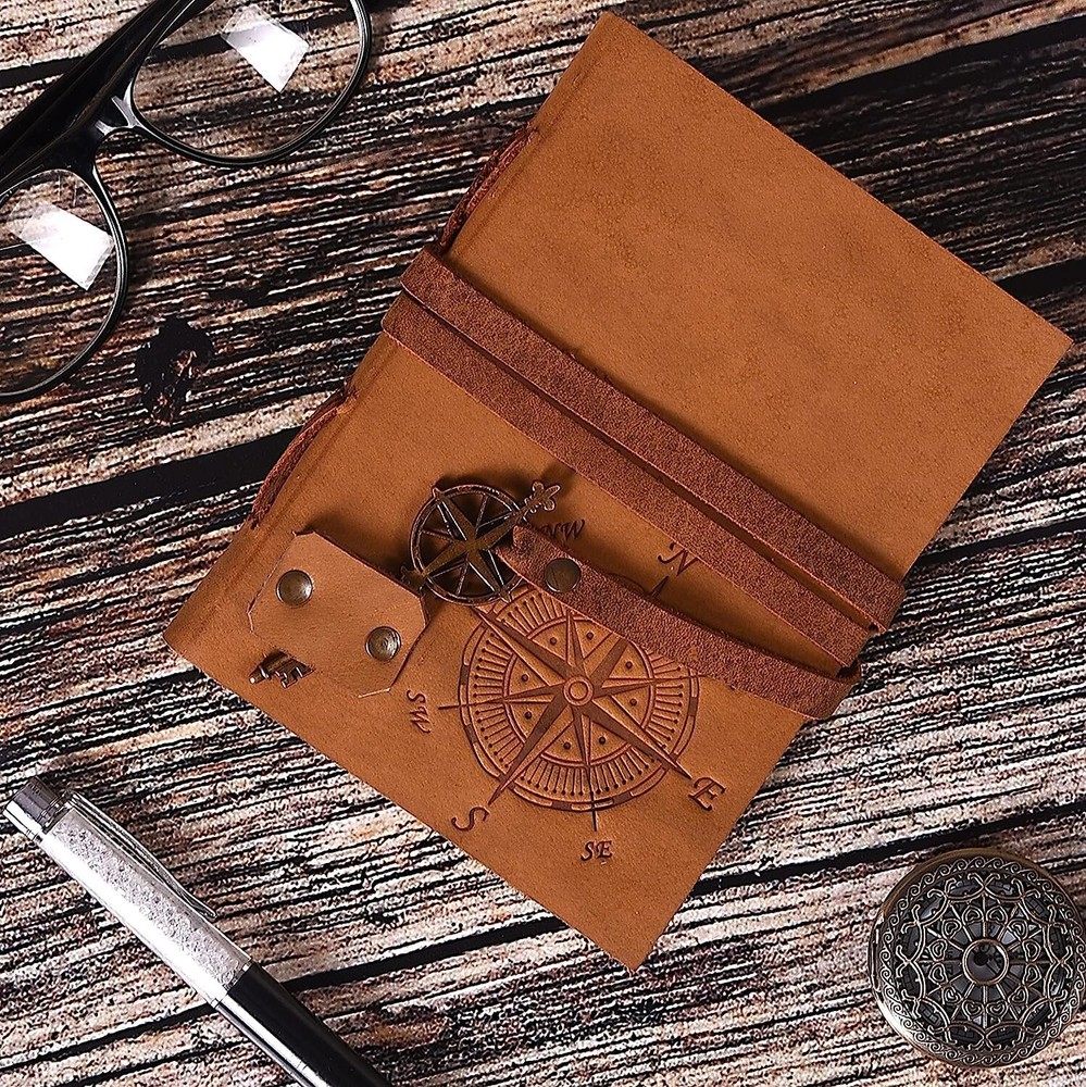 This Compass Leather Travel Journal Notebook is a must-have for anyone who loves to explore the world. The handmade leather bound notebook is perfect for keeping track of your travels, thoughts, and ideas. The cover material is made of high-quality leather from India, ensuring durability and style. The unit type is a single unit, and the unit quantity is one. This notebook is perfect for those who want to keep a record of their adventures and reflections. It is ideal for use as a diary, journal, or planner. Get ready to embark on a journey of self-discovery and adventure with this Compass Leather Travel Journal Notebook. *Product details Customized size Size - 7x5 inches (200 on both sides) Size - 8x6 inches (200 on both sides) Size - 9X12 inches (200 on both sides) Paper - 100 pages (200 on both sides) Paper - Pure Cotton Hand Made Plain Paper (Unline) Leather Colour: Brown and dark brown Leather - Full Grain Leather (Best Quality) Soft and durable natural handmade leather Quality Metal Hardware (Brass metal) Ideal gift for writers, poets, artists etc. Tied with traditional sewing methods *Materials: Full Grain Leather, Antique Brass Hardware, Handmade Sheets, Natural Leather, Handmade Paper, Unlined Paper, Leather Journal, Leather Diary, Leather Unlined Diary, Blank Paper Diary, Leather Cover, Notebook, Leather Sketchbook Artist Sketchbook, Photo Album, Traveling Notes, Business Executive, Logbook, Poetry Work, Journalist, Food Planner, Instagram Scrapbook, Bible Journalism, Documenting Your Spiritual Journey, A Dream Journal, A Book of Shadows, Grimoire, Sketchbook, Idea Book for Ideal , prayer book, gratitude journal, a daily journal or anything else you can think of. Luxury, Handmade, Fair Trade and Eco-Friendly Capture and share your thoughts before you walk away Handy for handwriting, drawing or sketching and compact to carry in your bag hpprox 100 sheets/200 pages of online paper Hand crafted non-bleeding paper made from recycled cotton that is chemical free Due to the Coptic binding process, this magazine is not refillable - it is unique in its kind! Hand-stitched Coptic leather binding secures pages firmly Suitable for all pens and pencils easy to care for Wipe slightly dry with a tissue, or rub in circular motions to reduce scratches and dust Shipping&Delivery Free worldwide shipping on all products. USP Inspired by distressed vintage style Handcrafted by Me and Skilled Village Artisans Fair trade factory price (no middleman) GUARANTEED HIGH QUALITY SELECTED LEATHER y friendly (no chemicals used) Handmade recycled cotton pit paper Welcome to the world of Leather Diary Handmade by