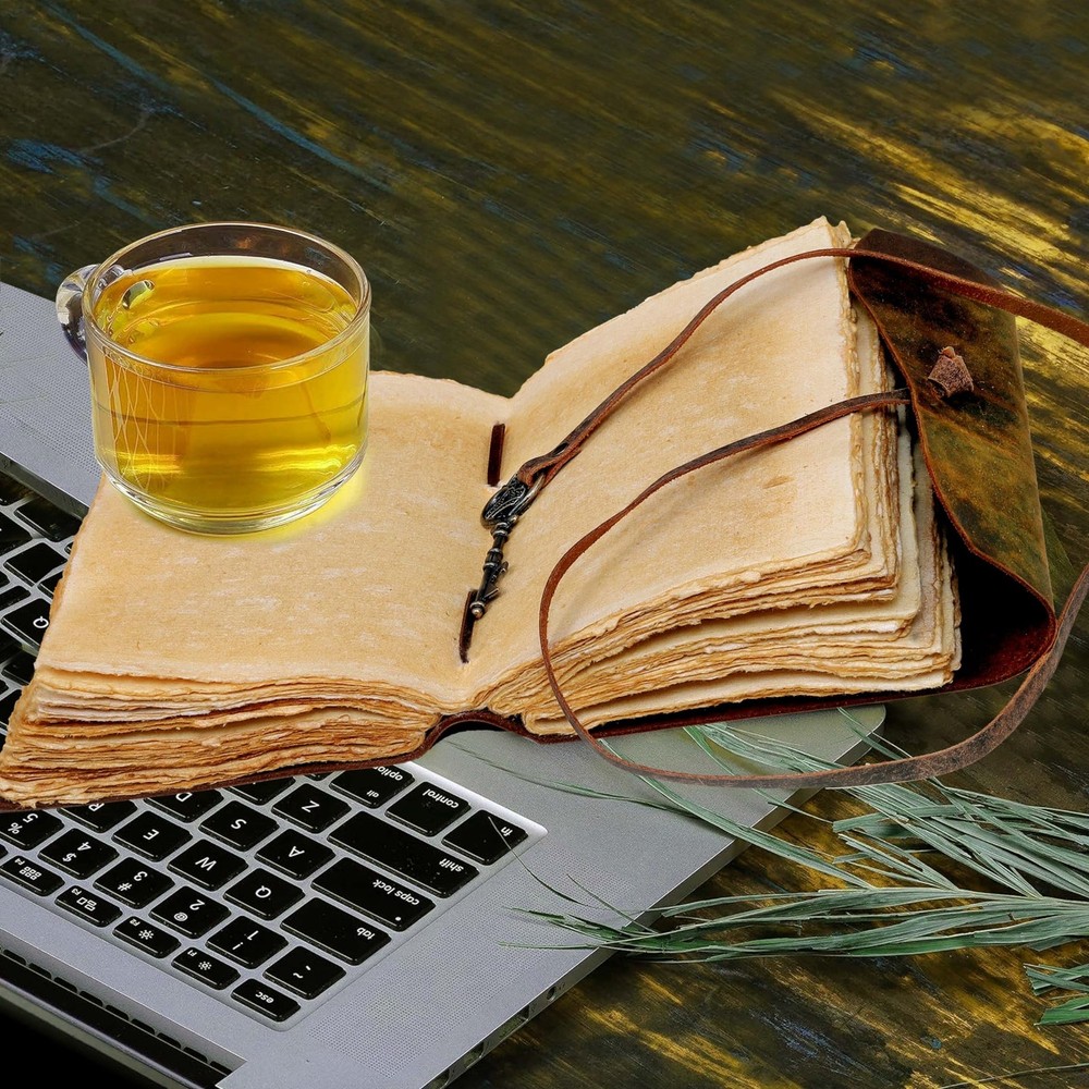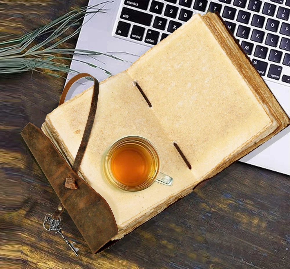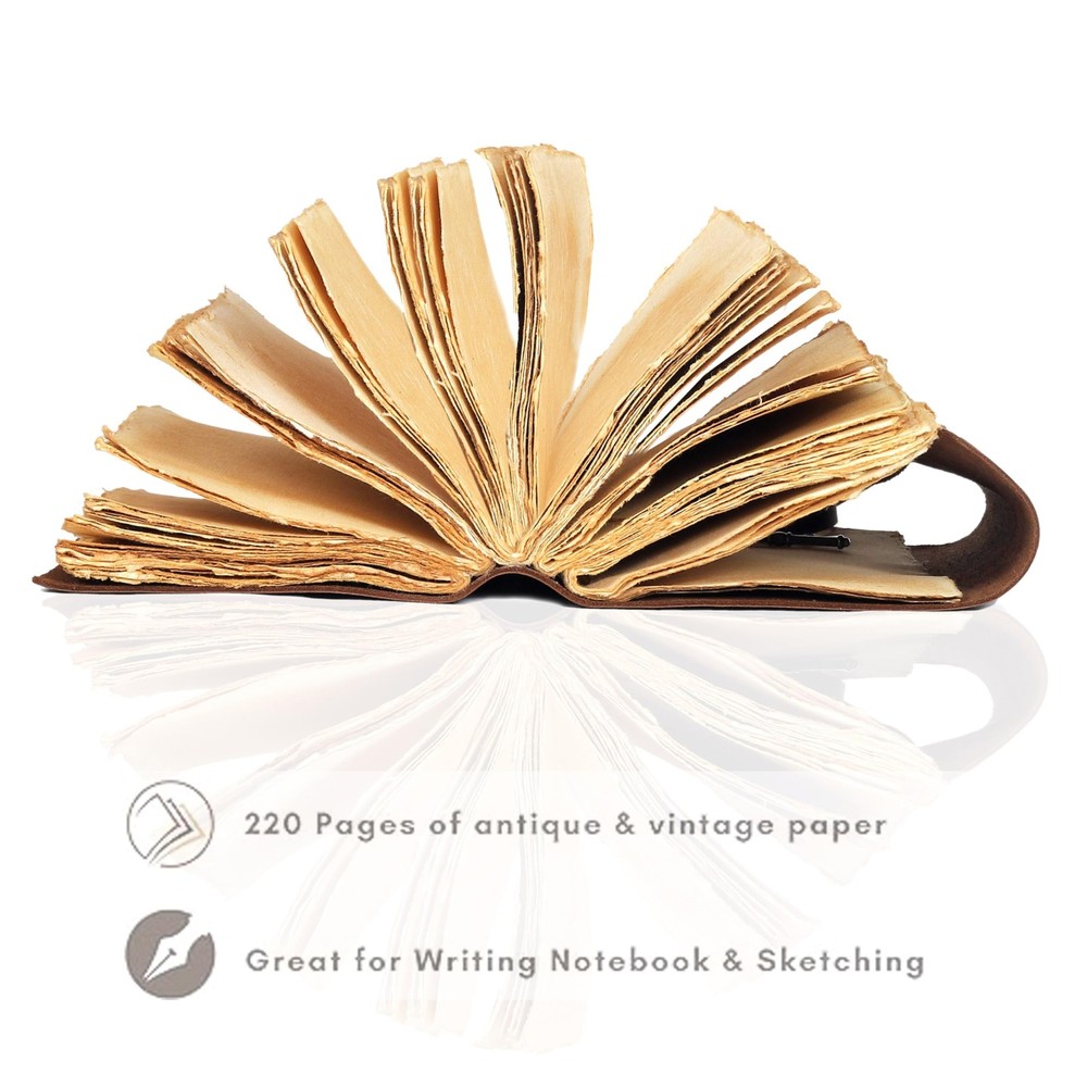 NOTE- COLOR CAN VARY PERFECT LEATHER NOTEBOOK HANDCRAFT JOURNAL - Made from 100% Buffalo Leather with Antique Deckle Edge Paper. 240 PAGES This Book Is Hand Crafted by Artisans Working with Leather for Decades. The Color of The Journal Is Very Unique Vintage Brown. USE ANY KIND OF PEN - Write/sketch/doodle on your classy journal notebook with a Fountain Pen CalligraphyPen, Ball Pen, Brush Pen, Acrylic Colours, Watercolor. IDEAL USE AND PERFECT GIFT – Perfect Use for Business Executive, Poetry Work, Journalists, Craftsman, Writer. A Lovely Treat for Your Loved Ones for An Anniversary, Birthday or Graduation Present, Or for Someone Starting A New Adventure and A Perfect Gift for Those Who Love Vintage One. DIMENSIONS - (8” X 6” X 1.5”) With Uncut Deckle Edge Paper, Easily Handle Notebook, You Can Fit with Minimum Space, Easily Handle in Long Journey. Once You Have Used It You Will Feel Like You Have the Best Journal in the World. HAND WORK BINDING AND KEY BOOKMARK – Binding Is Made by Hand Stitching Which Having Enough Strength That the Paper Never Comes Out. The Key Is Very Antique Can Be Used as Bookmark. The Leather Strap Wrap Around the Journal Is Complete Solution for Paper Safety and Open-Close the Journal. The Journal Made by High Quality Buffalo Leather and Paper Have Been Used Is Vintage Historical Paper Which Is Very Durable. Any Quality Issue Let Me us we will replace it without quetion and its 100 % leather and paper made from waste material we never use tree for paper you will love it this